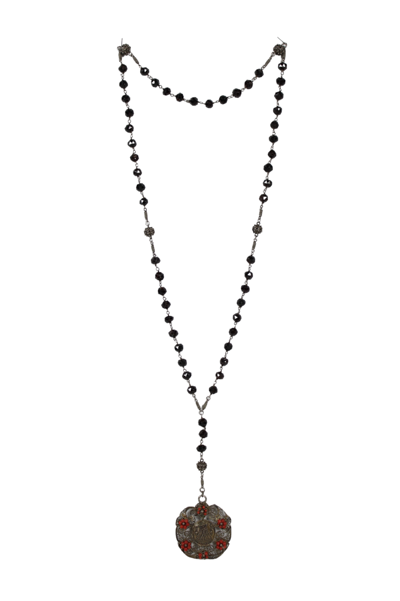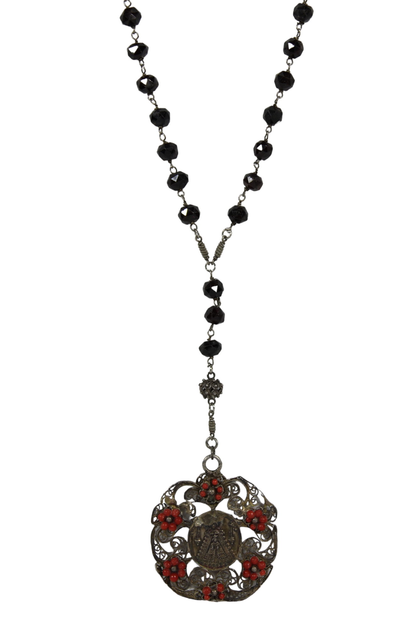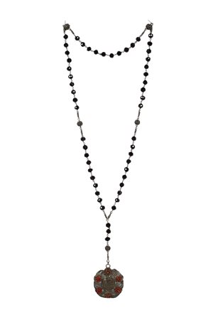 ROSARIO in argento e perline di granati sfaccettati con medaglione in filigrana d'argento arricchito da perline in corallo trapanese usure e mancanze XIX secolo
