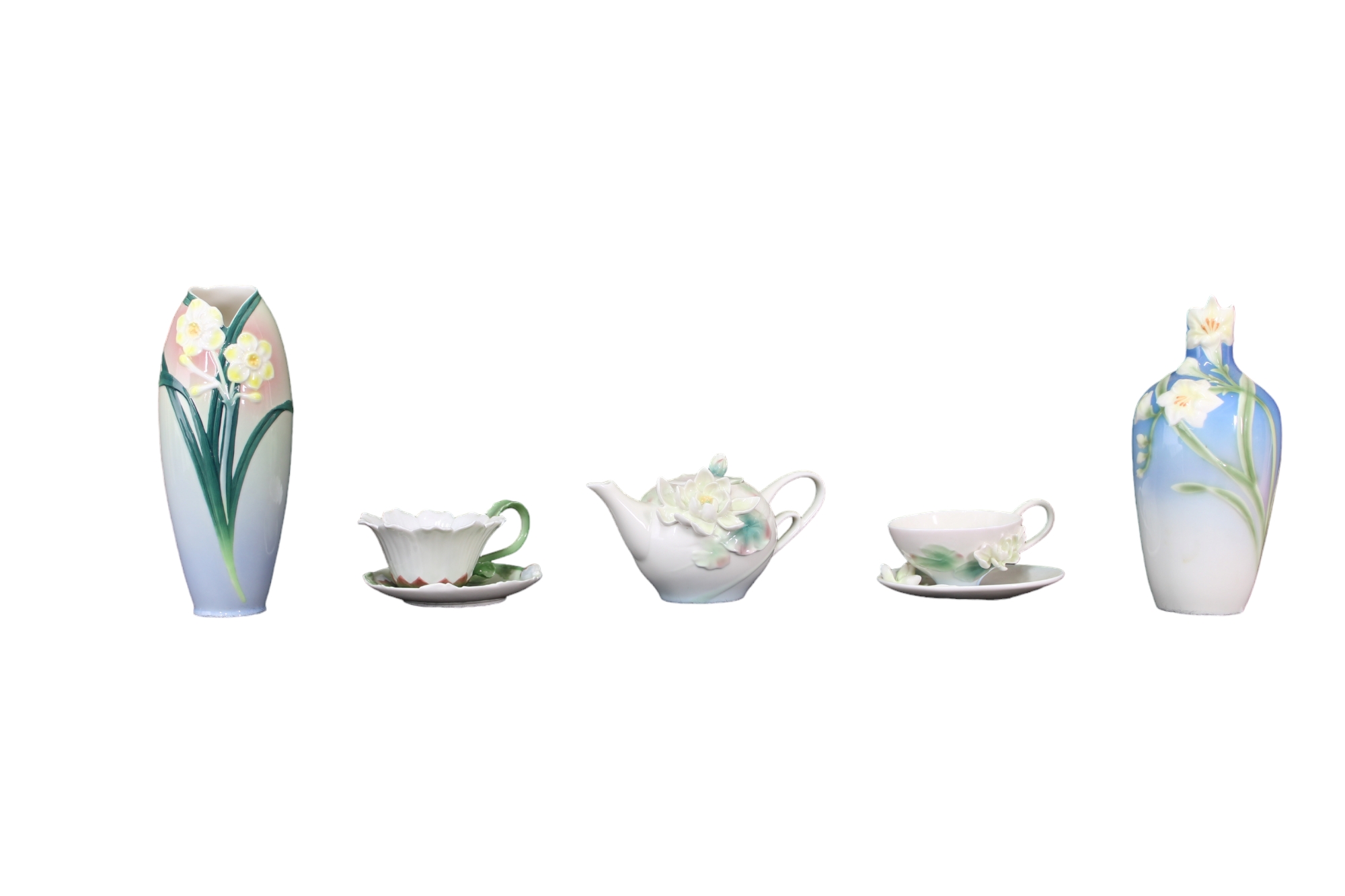 LOTTO COMPOSTO DA 2 vasi 1 caffettiera e 2 tazzine in porcellana dipinta manifattura Franz XX secolo misure varie