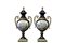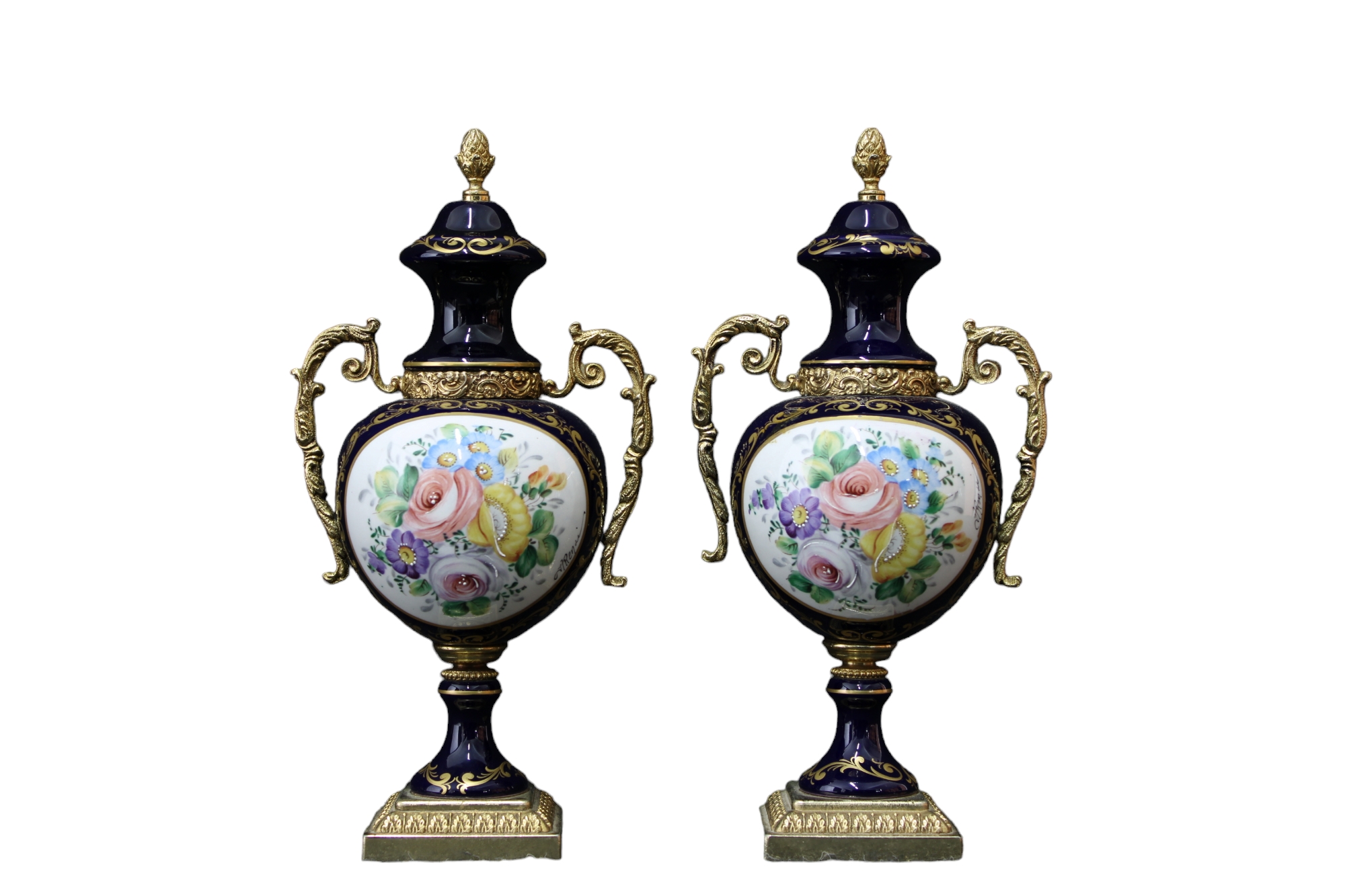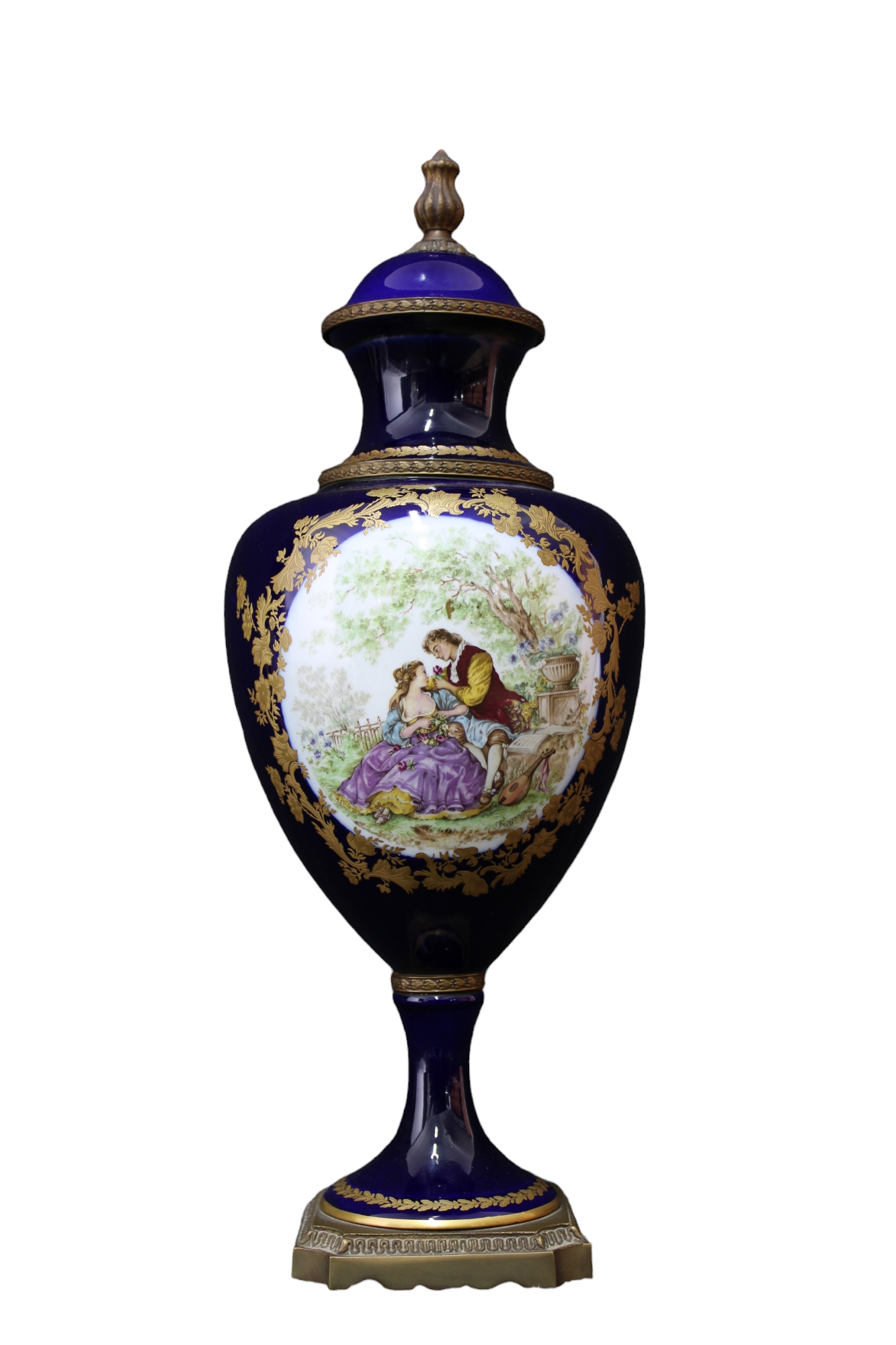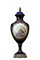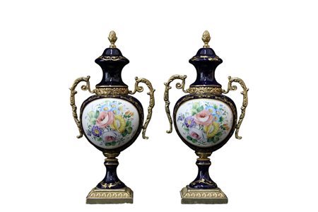 LOTTO COMPOSTO DA 3 vasi in porcellana a fondo blu cobalto e lumeggiature in oro dipinte dentro riserva raffiguranti 1 scena galante e la coppia decorata a motivi floreali montati in bronzo cesellato e dorato Francia XX secolo h cm 53 x 21 / h cm 22,5 x 11