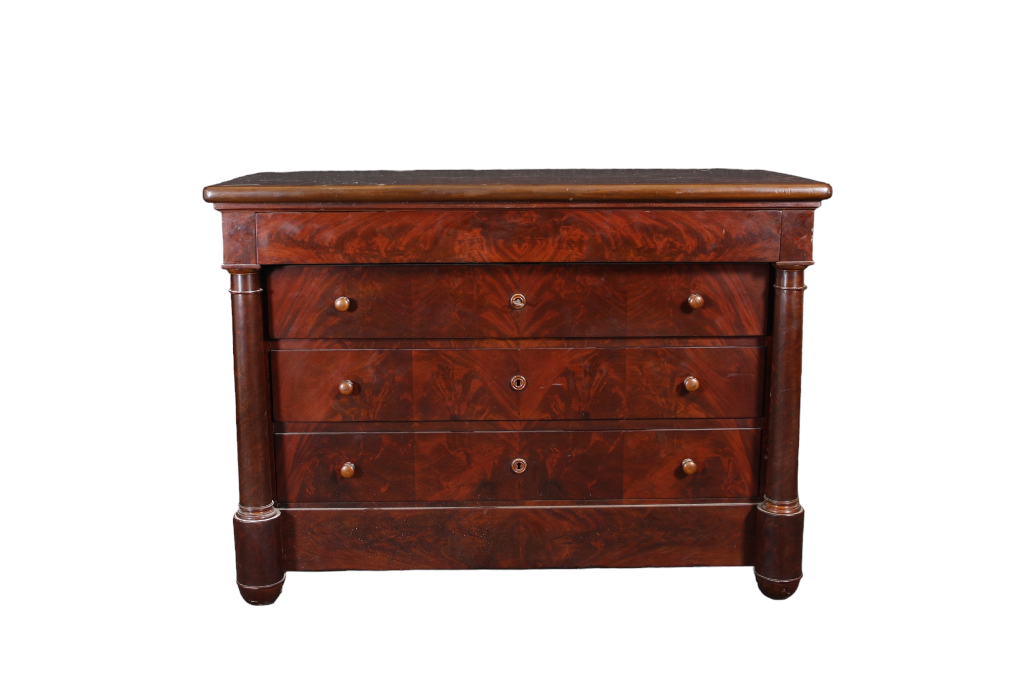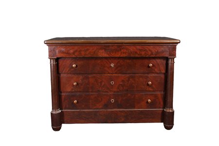CASSETTONE IMPERO in piuma di mogano a 4 cassetti con colonne e capitelli torniti ai lati Francia XIX secolo h cm 92 x 129 x 60,5