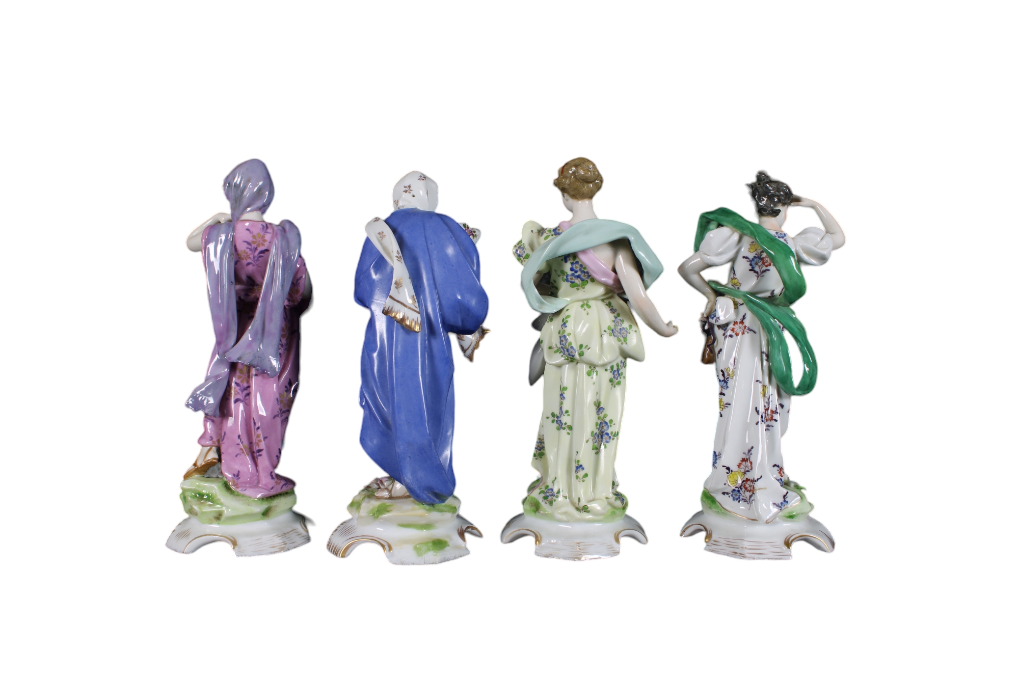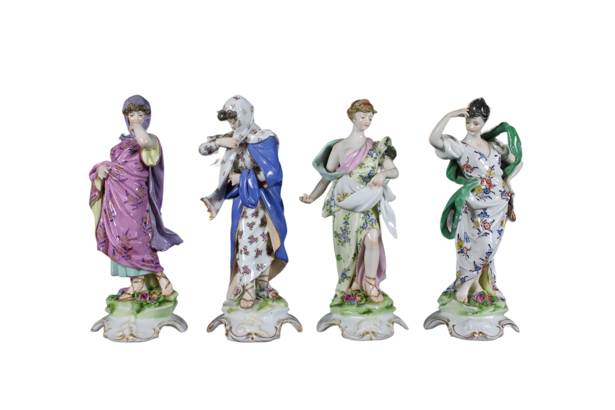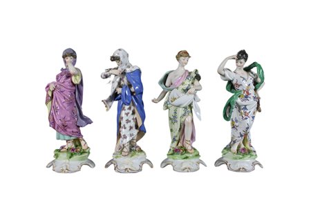 4 STAGIONI in porcellana policroma con lumeggiature in oro (nella scultura inverno lieve sbeccatura sotto la base) manifattura capodimonte primi 900 h cm 20,7 x 8