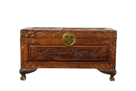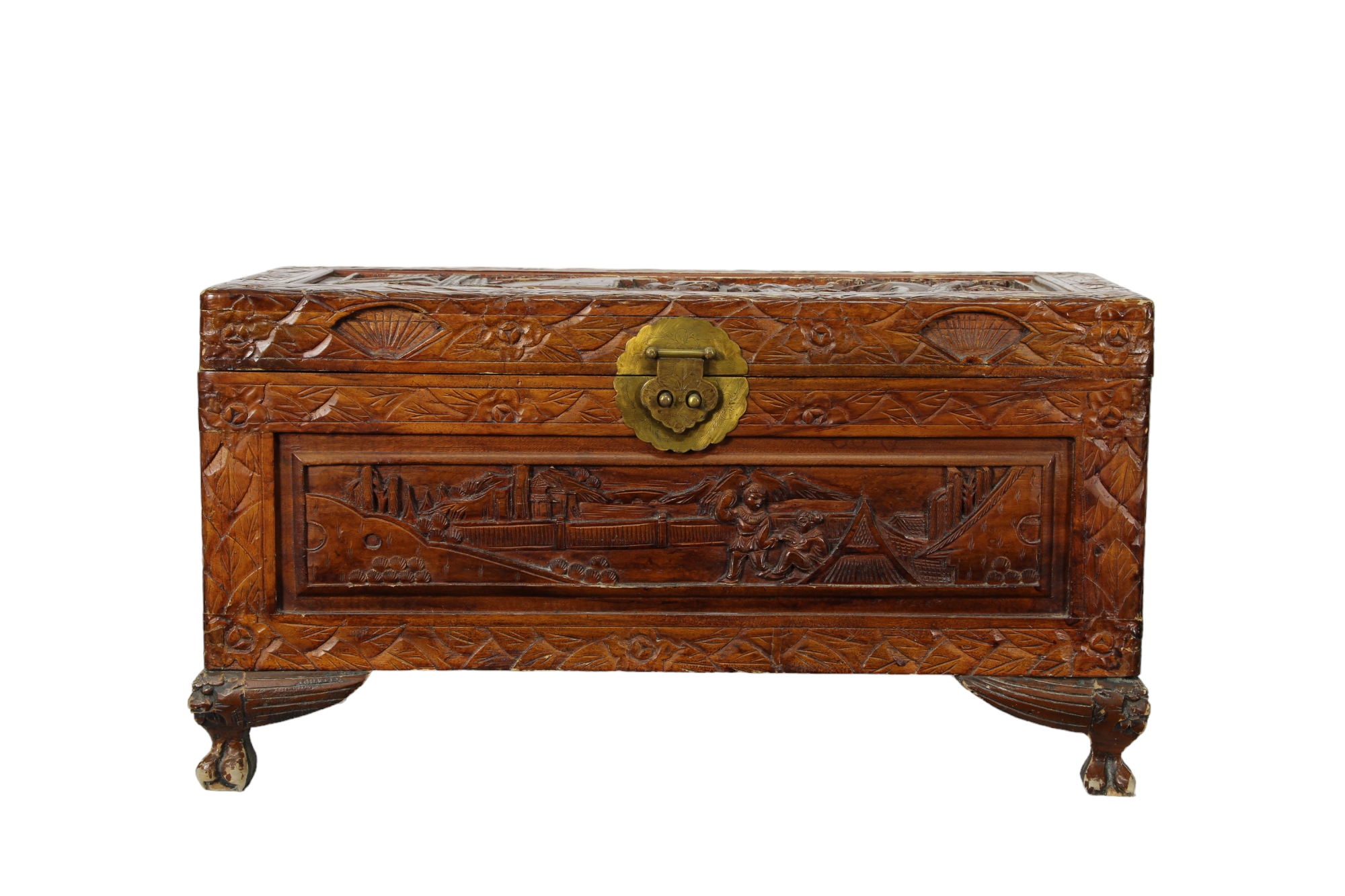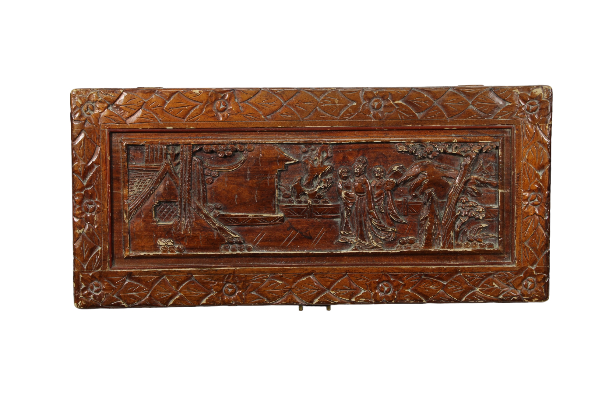 PICCOLA CASSAPANCA in legno riccamente scolpita raffigurante scene di vita manifattura orientale Primi 900 h cm 37 x 70 x 32