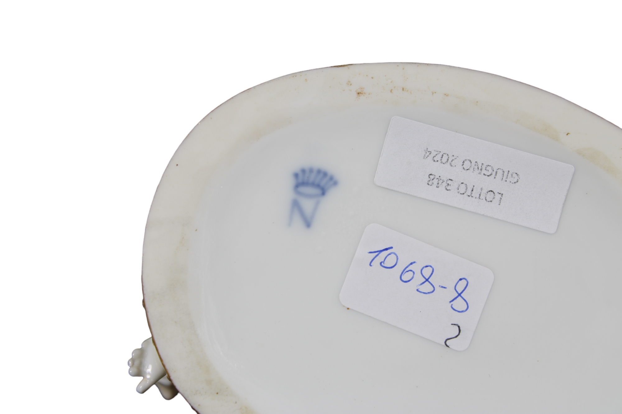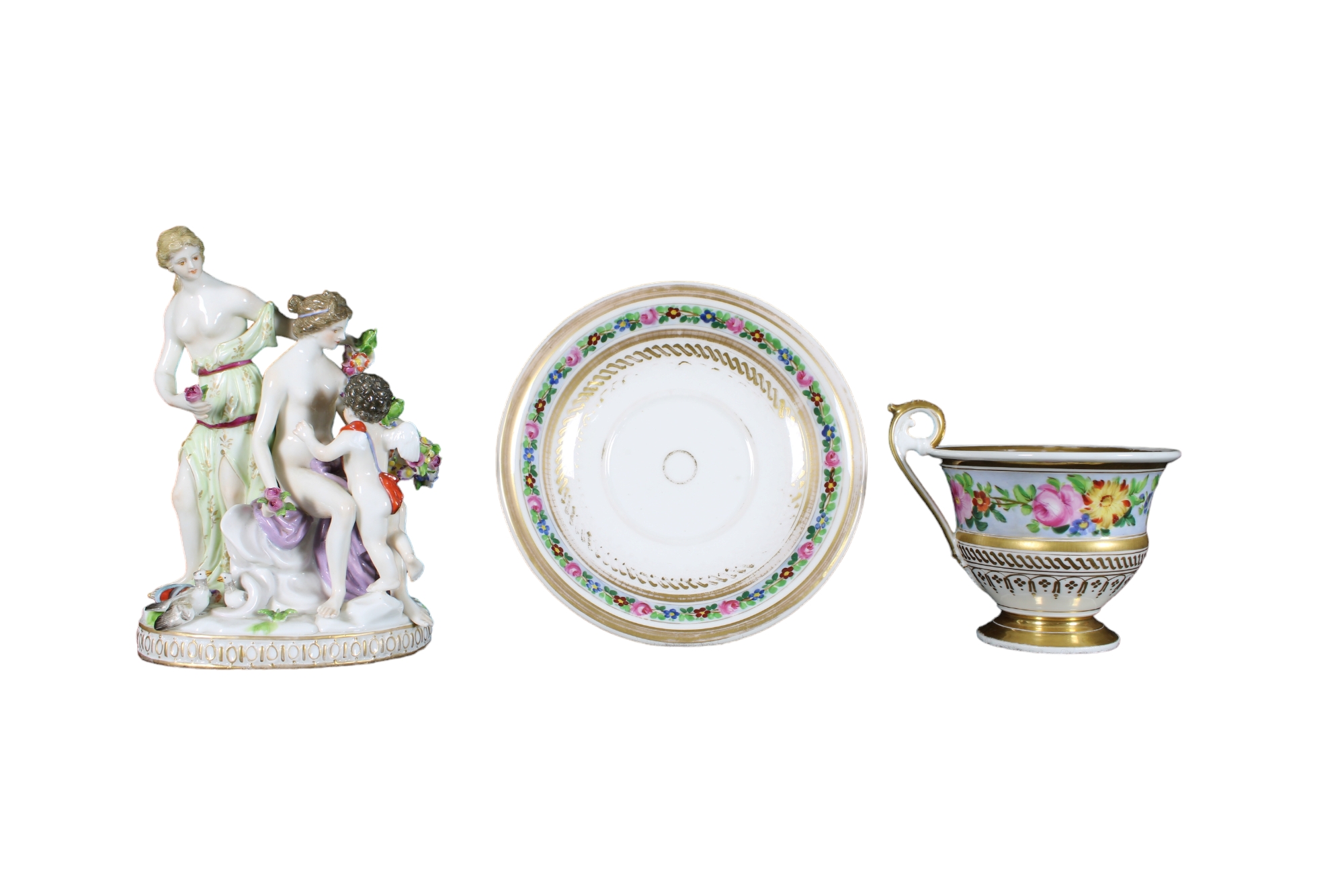 LOTTO COMPOSTO DA 1 gruppo scultoreo in porcellana policromo raffigurante allegoria della primavera manifattura Capodimonte primi 900' rottura e mancanza dell'ala del putto e 1 tazzina con piattino impero in porcellana dipinta a motivi floreali e lumeggiature in oro Francia XIX secolo sbeccata al piattino h cm 16,5 x 12 x 8,5 / h cm 9 x 15,5