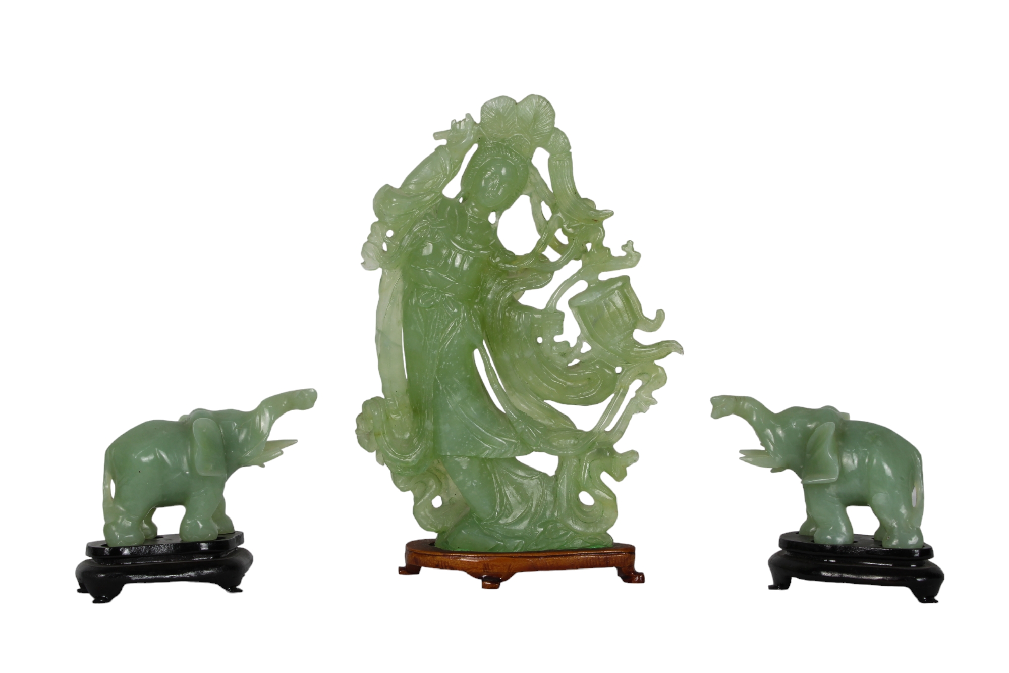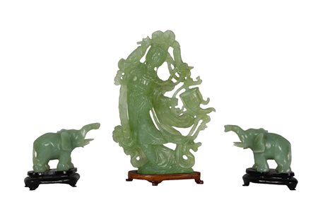 LOTTO COMPOSTO DA 1 gruppo scultoreo raffigurante geisha e 2 piccoli elefanti in giada verde con basi in legno 1 degli elefantini reca mancanze e rotture ad 1 zanna manifattura orientale XX secolo h cm 24 x 17 / h cm 10 x 5 x 11