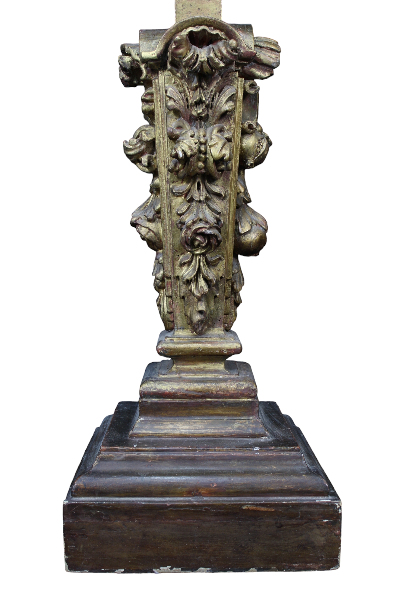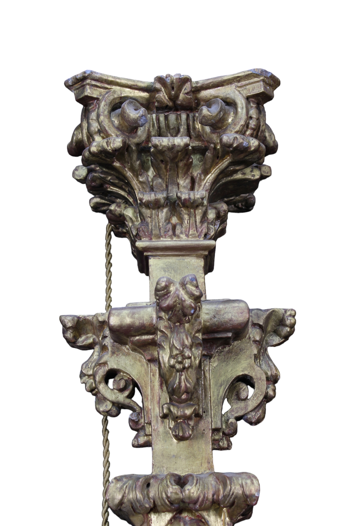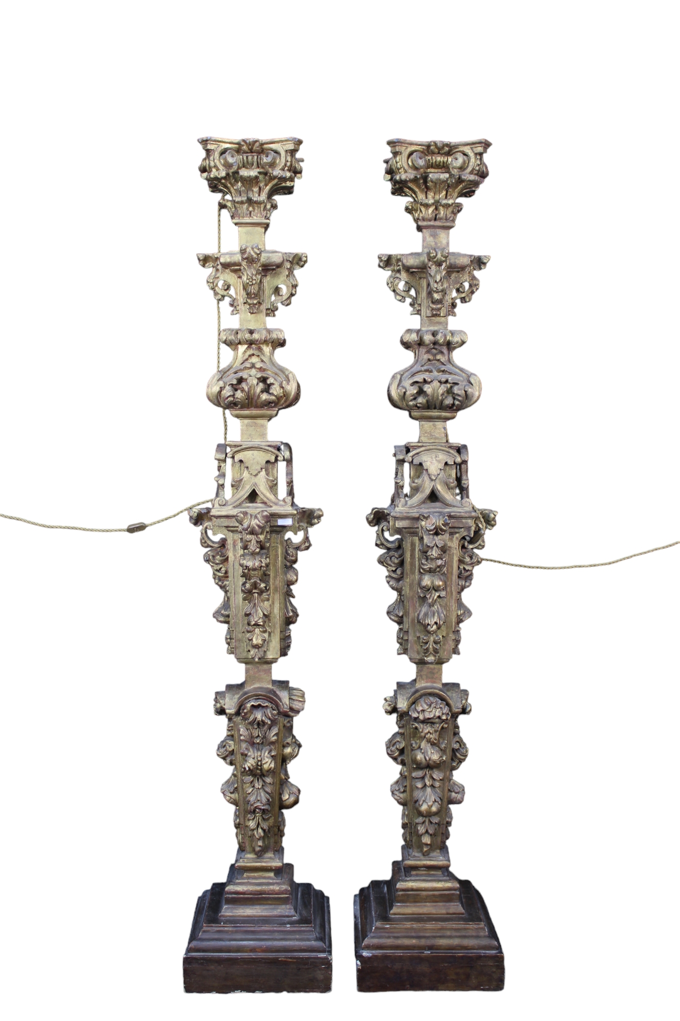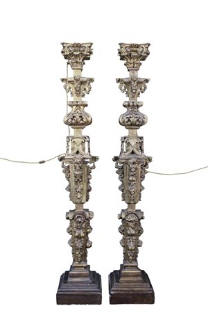 COPPIA DI IMPORTANTI MONUMENTALI TORCERI a lesena in legno riccamente scolpito a motivi di tralci e frutta e dorato a oro zecchino maestranze toscane 1680-1720 h cm 228 x 40 x 40