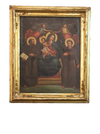 CORNICE DORATA ARGENTO E MECCA con stampa telata raffigurante Madonna e Santi Sicilia XIX secolo h cm 73 x 59