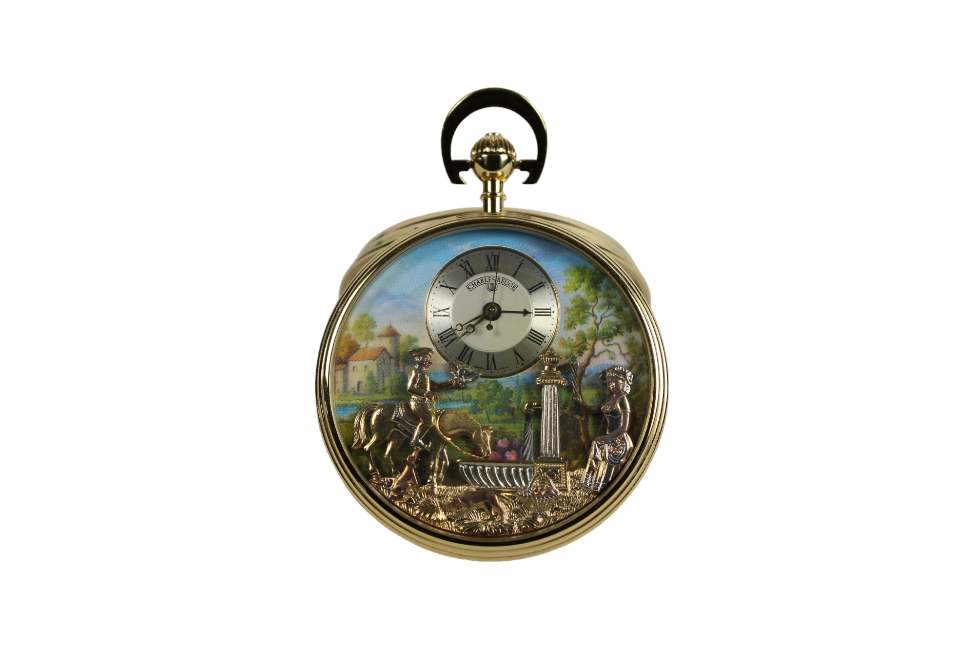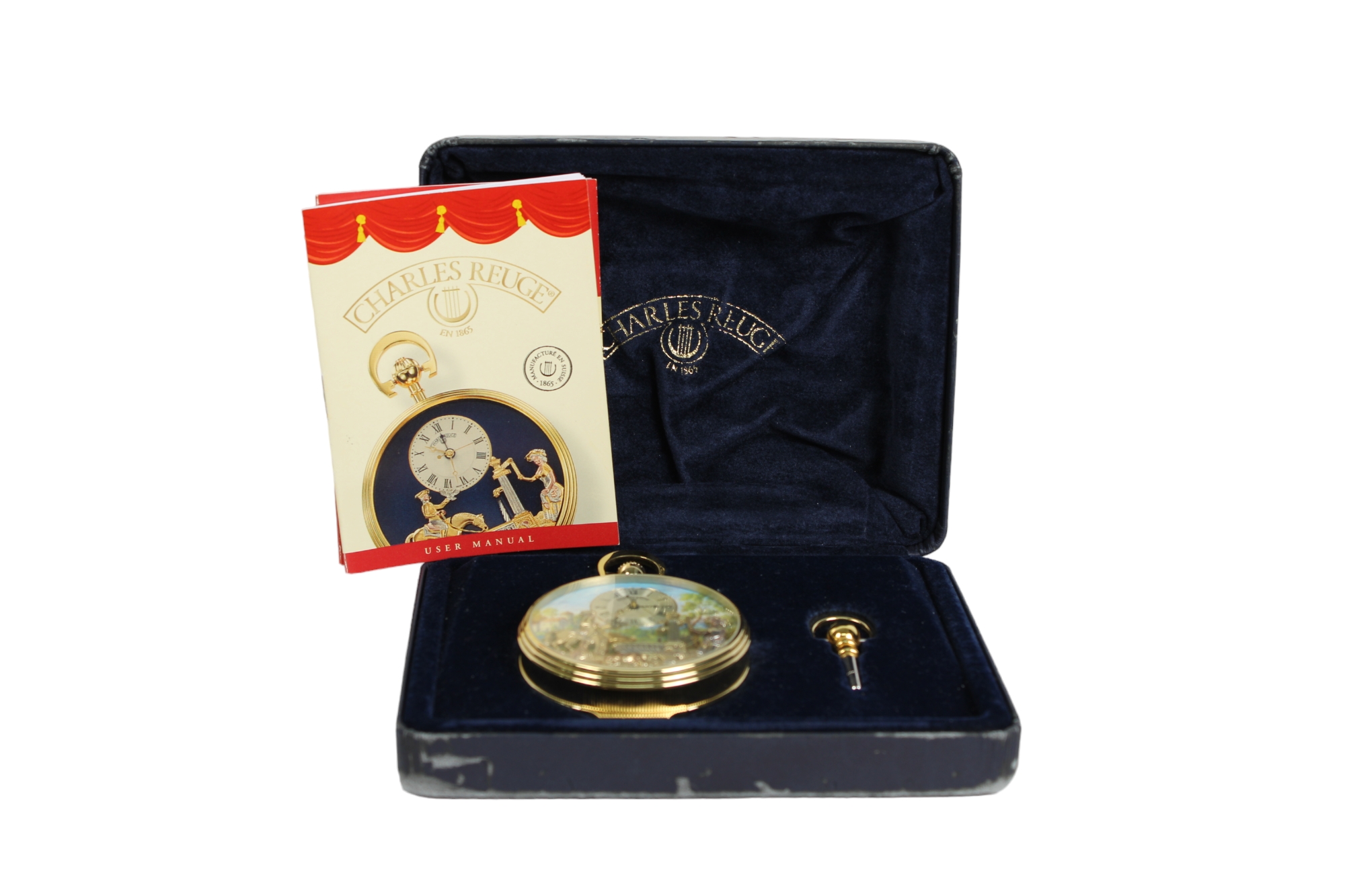 CHARLES REUGE rarissimo orologio da taschino con carillon e automi placcato in oro funzionante, correlato da scatola e certificato di garanzia XX secolo