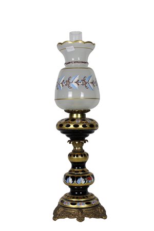 LUME DA TAVOLO in vetro intagliato dipinto con lumeggiature in oro boccia in vetro satinato e dipinto con montatura in bronzo dorato Francia fine 800 h cm 62 x 18