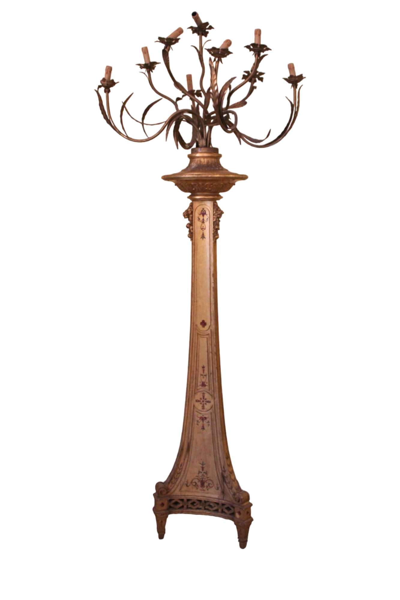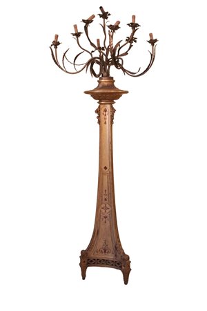 ELEGANTE PIANTANA in legno finemente scolpito laccato e dipinto con ceppo porta candele a 9 luci in ferro dorato Sicilia XIX secolo