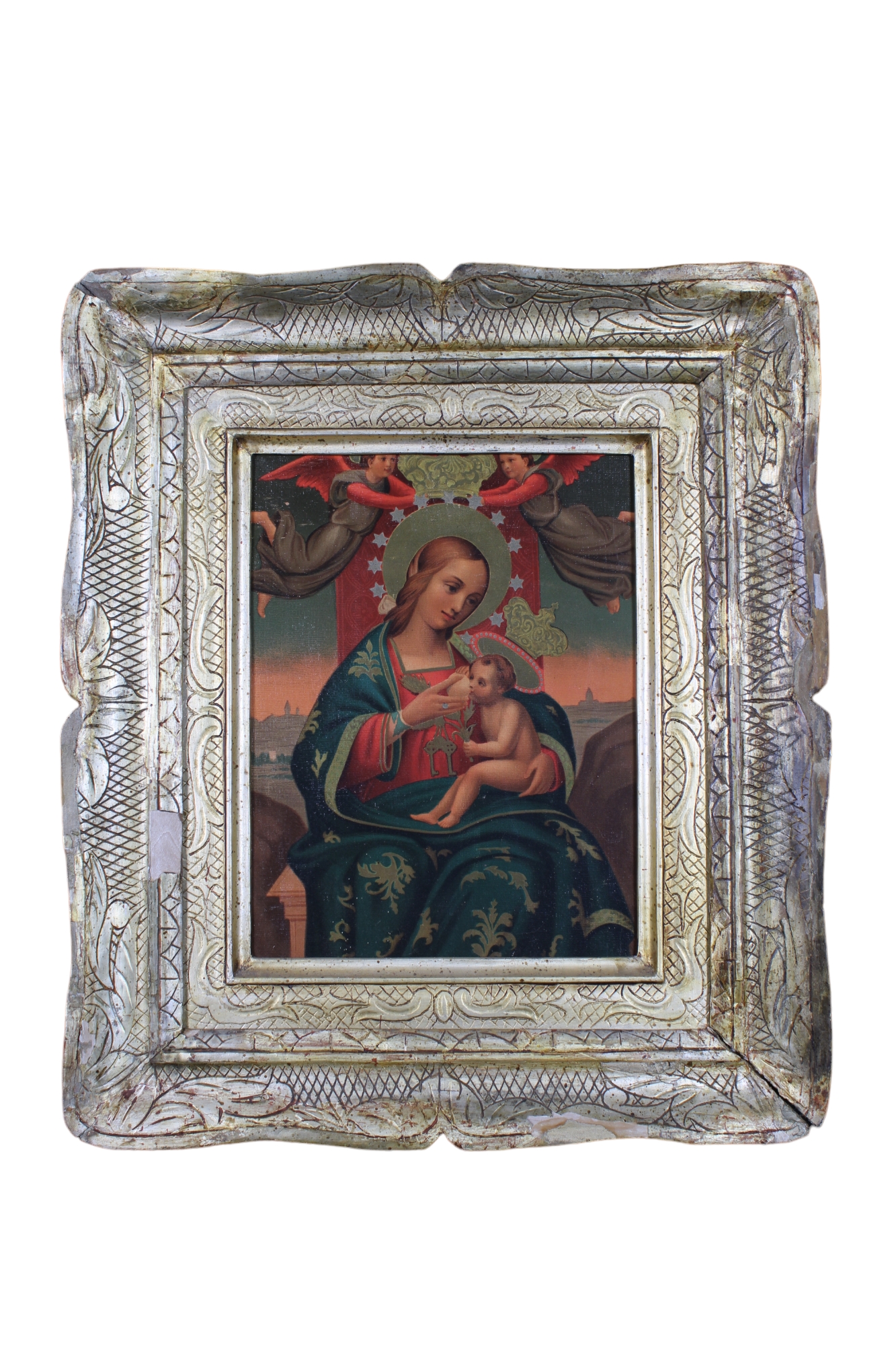CORNICE A GUANTIERA in legno inciso e dorato ad argento e mecca contenente stampa telata raffigurante madonna con bambino e angeli , usure e mancanze Sicilia XIX secolo h cm 39 x 27 / h cm 55 x 47