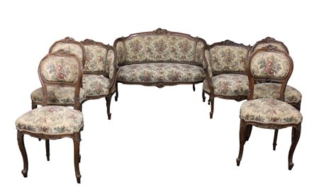 SALOTTO COMPOSTO DA divanetto, 2 poltrone e 4 sedie in noce con intagli alle spalliere Sicilia fine 800
