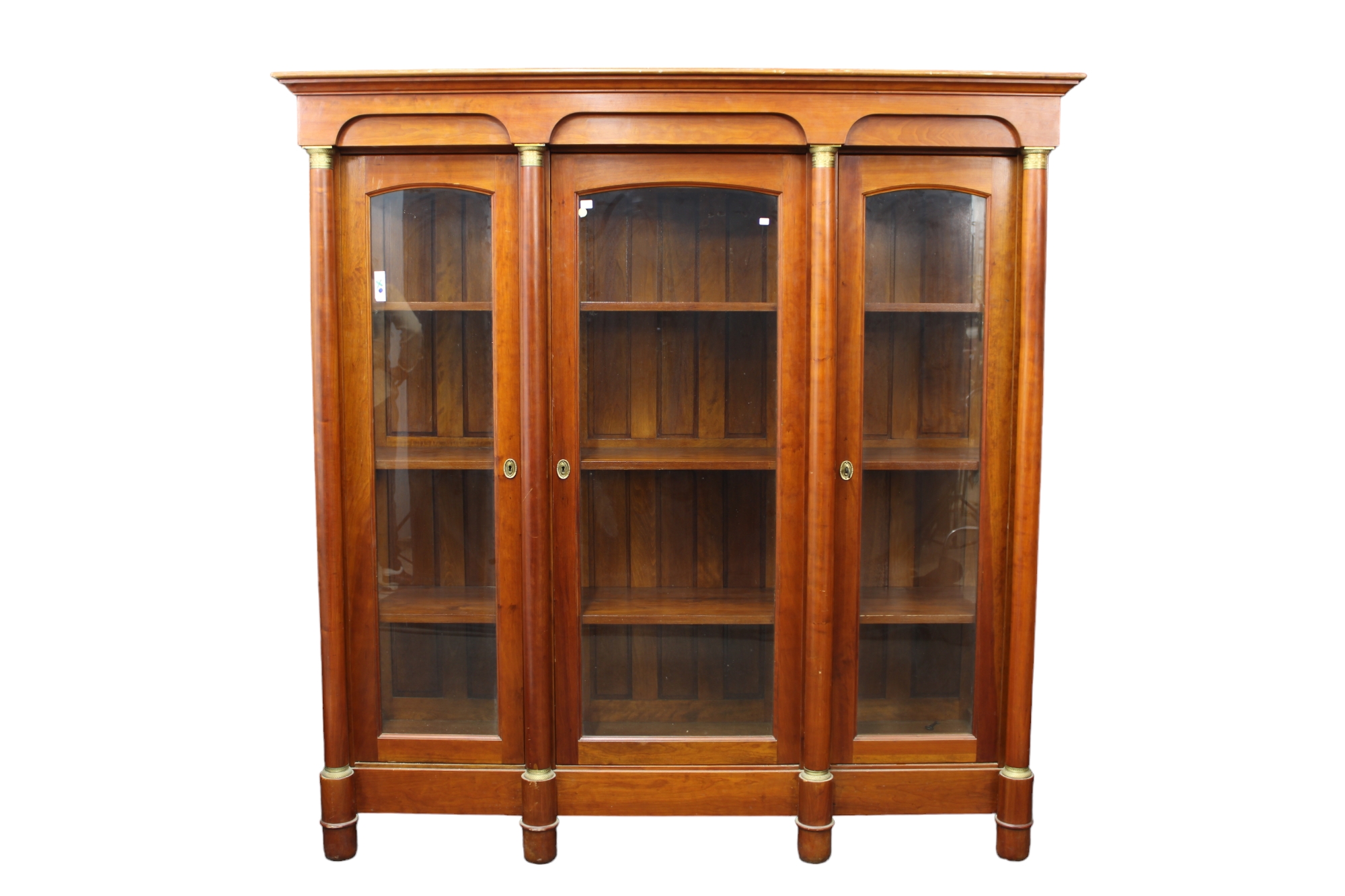 VETRINA DI GUSTO IMPERO in legno di ciliegio a 3 ante con vetri sostenuta da colonne con base e capitelli in bronzo cesellato e dorato maestranze italiane fine XIX secolo h cm 188 x 185 x 52,5
