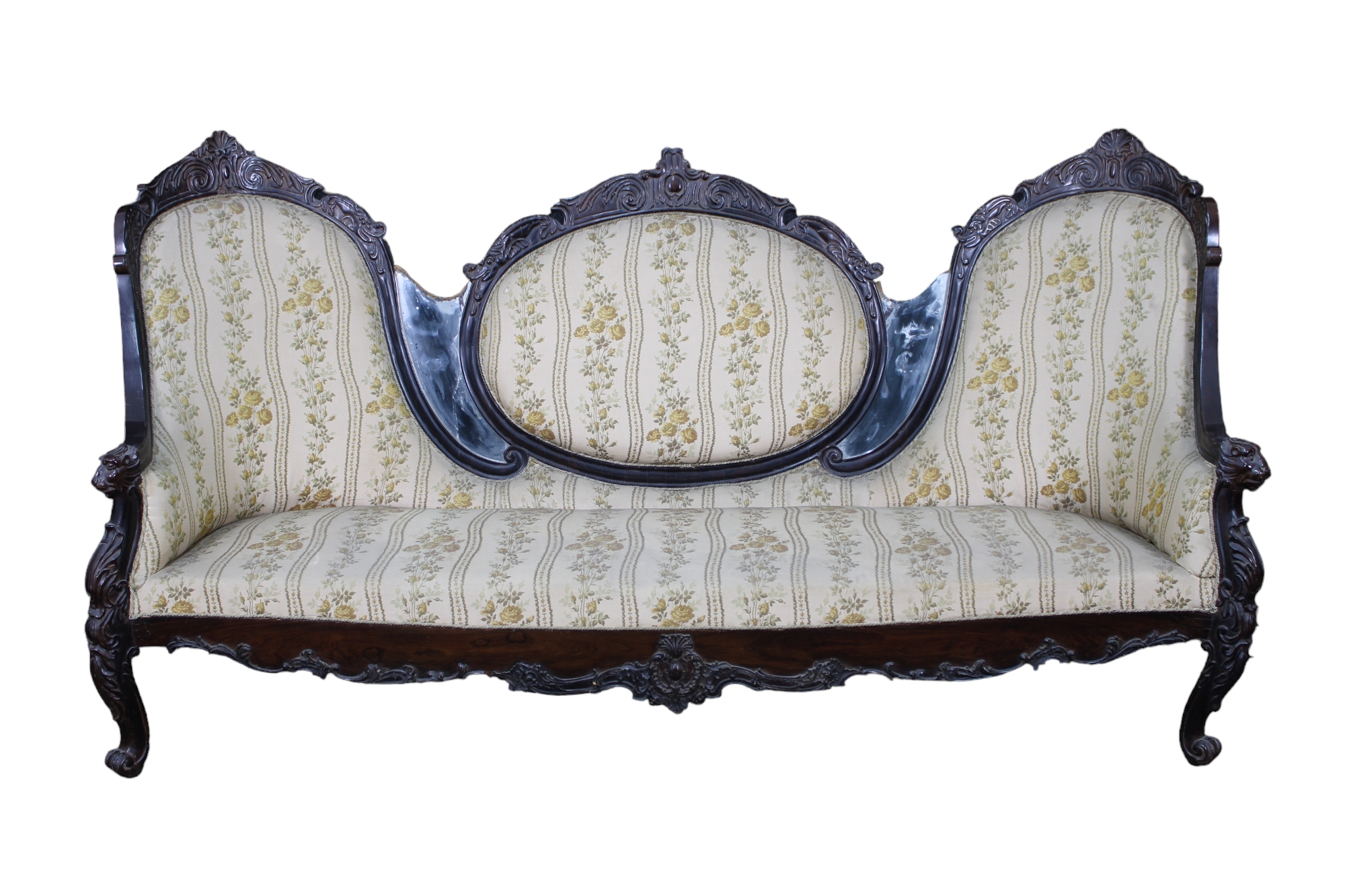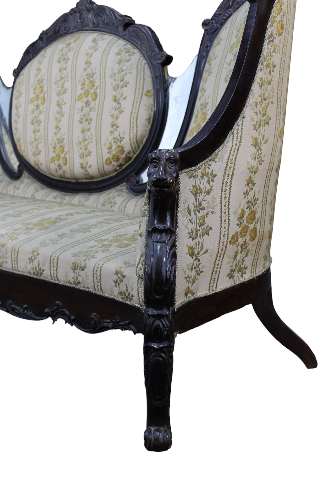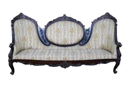GRANDE DIVANO in legno di noce riccamente scolpito raffigurante figure leonine Sicilia primi 800 h 127 x 230 x 80