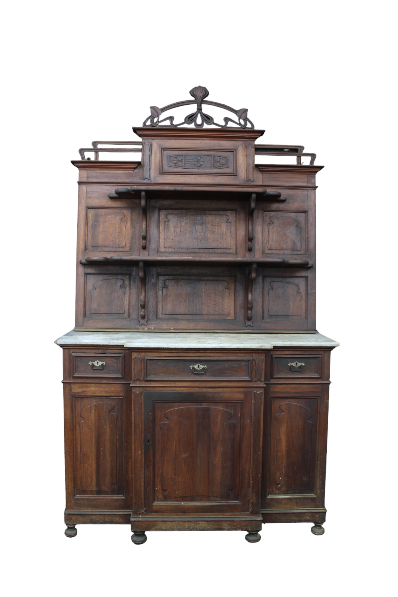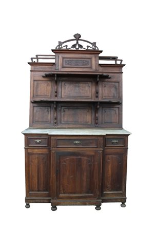 PIATTAIA LIBERTY in legno di noce riccamente scolpita a motivi floreali parte inferiore a 3 sportelli e 3 cassetti parte superiore a 2 mensole con piano in marmo bianco di Carrara h 258 x 146 x 52