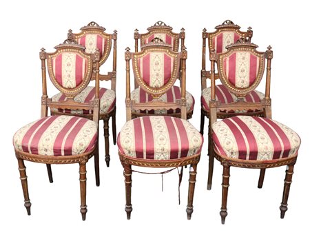 LOTTO DI 6 SEDIE stile luigi XVI in noce con decoro di intagli e lumeggiature in oro Sicilia fine 800 h cm 86 x 41 x 42