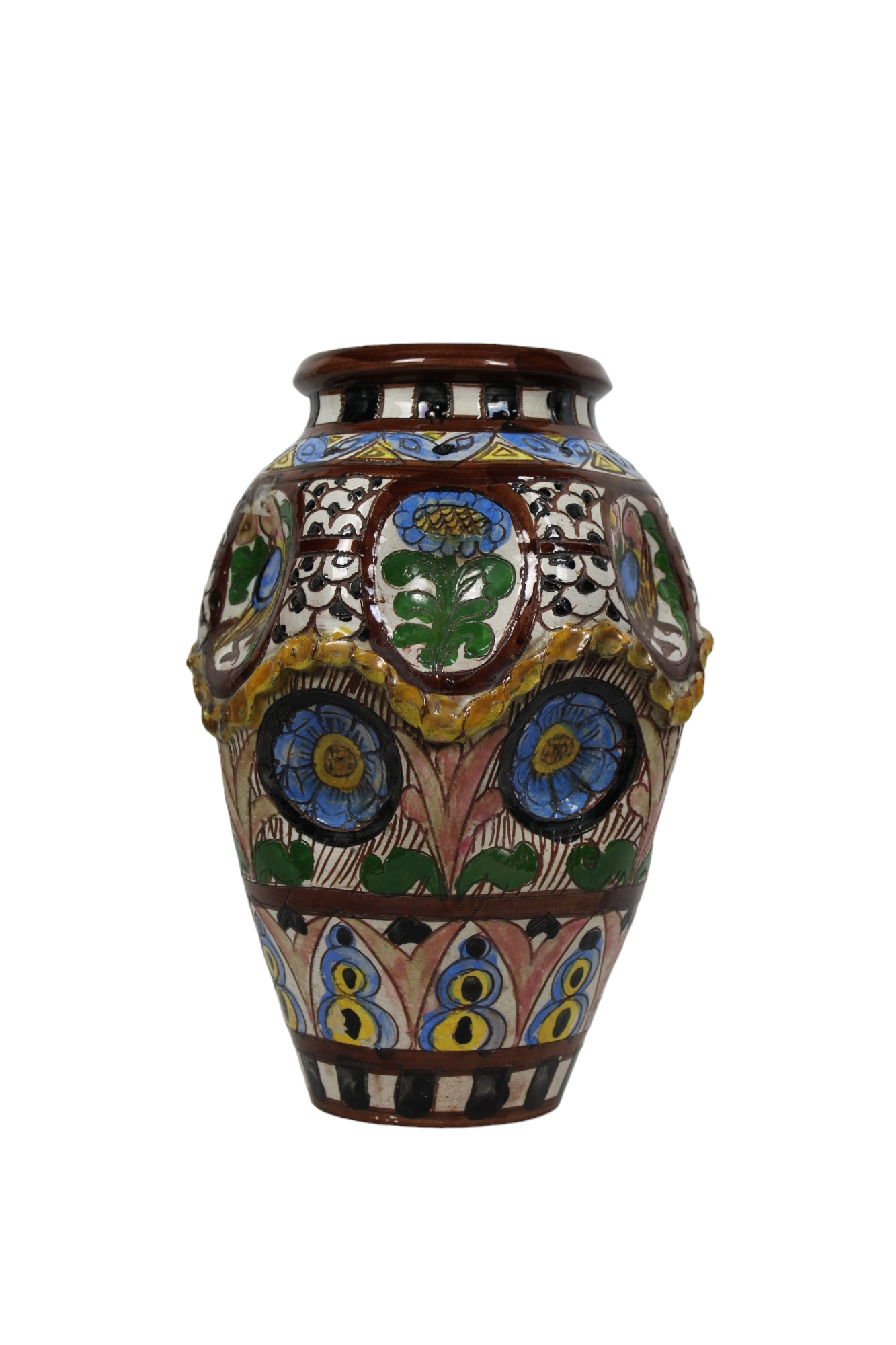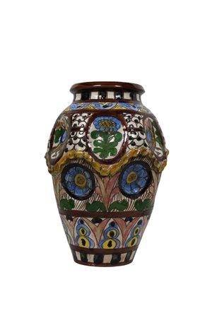 CURIOSO VASO in maiolica dipinto in policromia raffigurante flora e uccelli , piccola sbeccatura alla base Sicilia XX secolo h cm 30 x 20