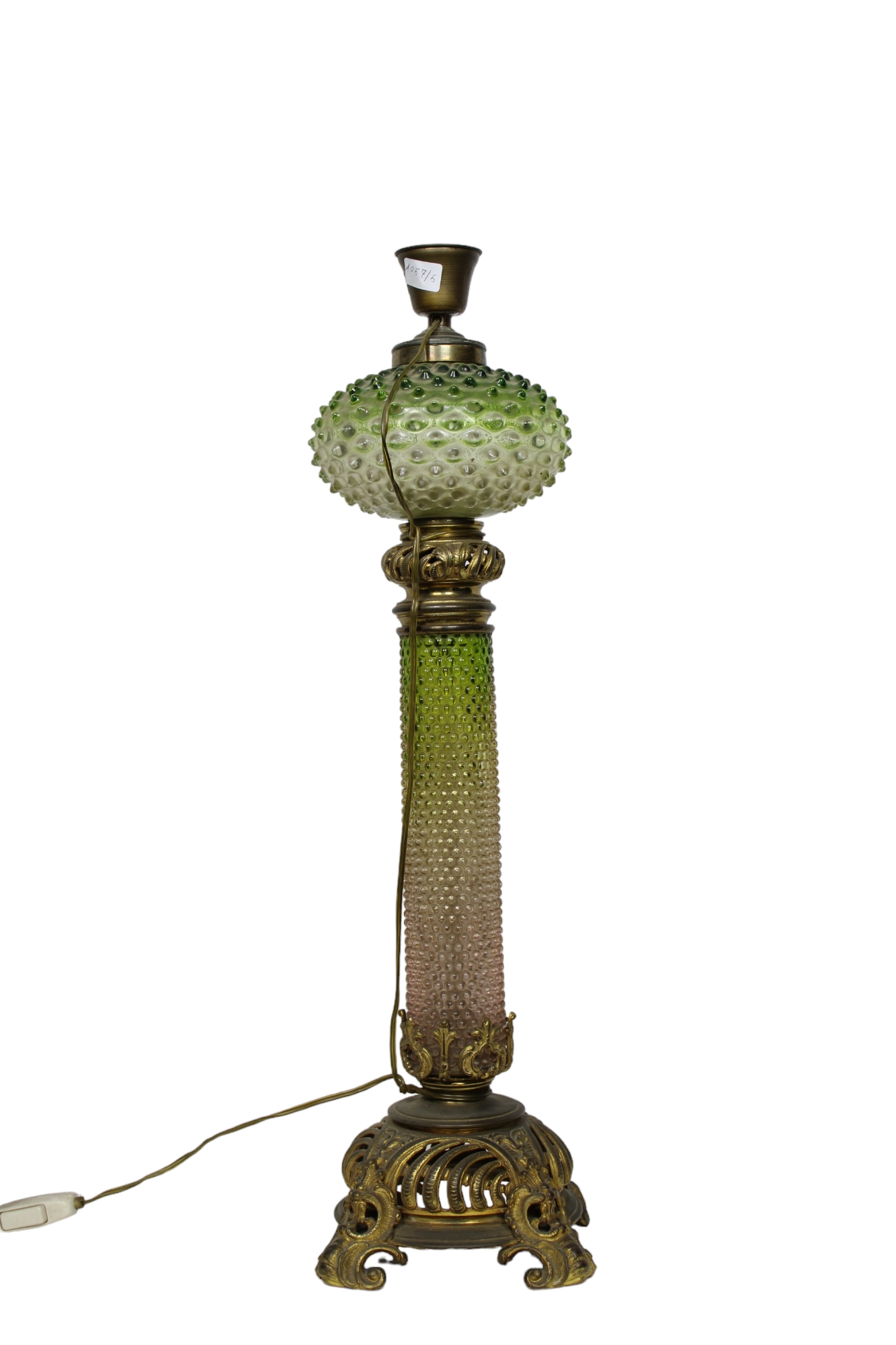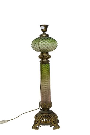 LUME DA TAVOLO in bronzo cesellato e dorato con fusto in vetro intagliato colorato Francia Primi 900 h cm 63 x 16