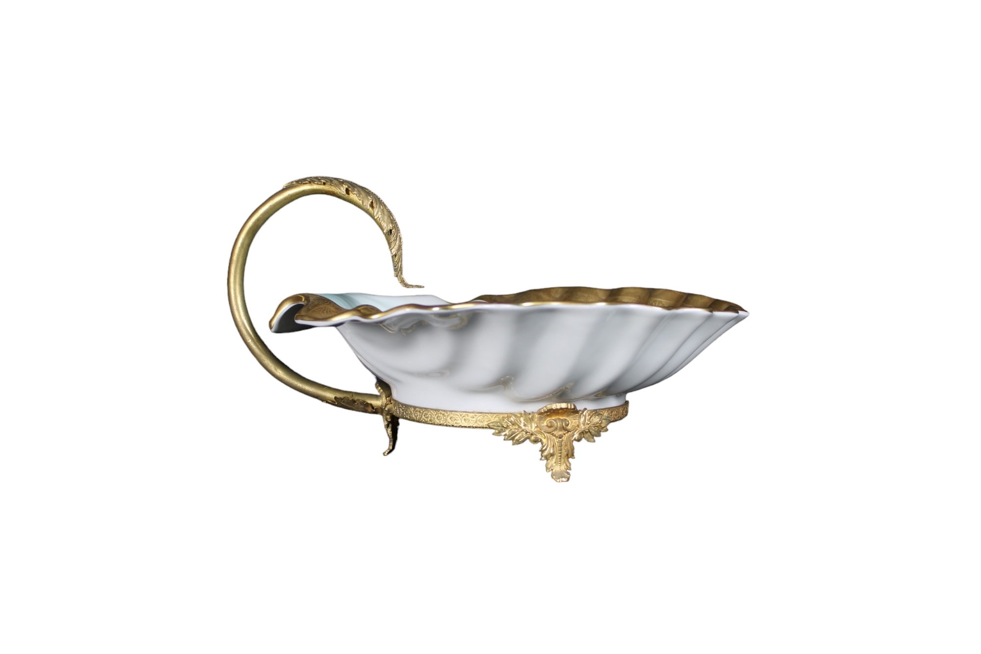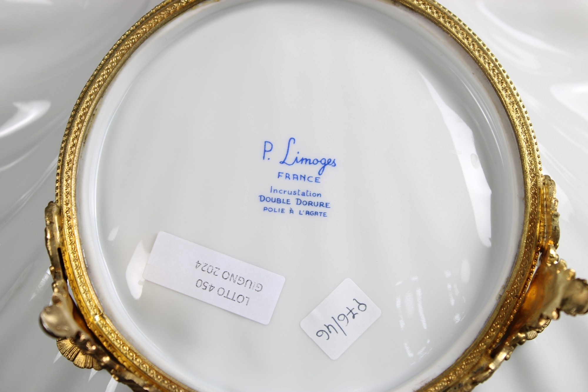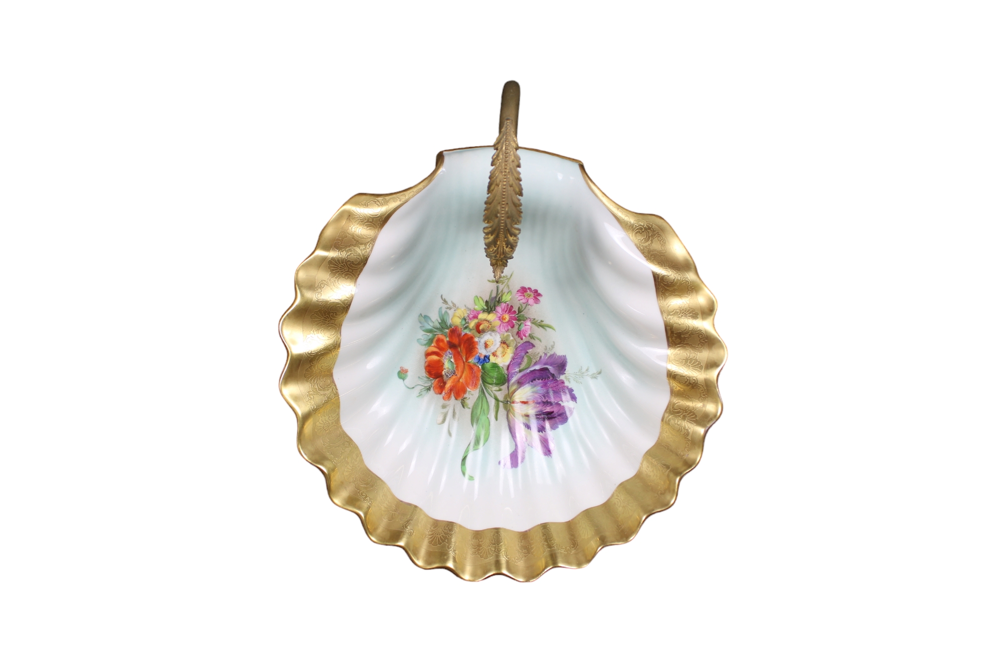 ALZATA a forma di conchiglia in porcellana dipinta a motivi floreali e lumeggia ture in oro montata su base in metallo finemente cesellato e dorato manifattura Limoges Francia XX secolo h cm 17 x 30