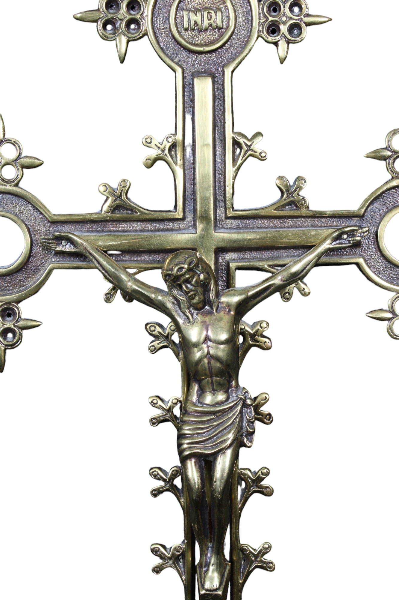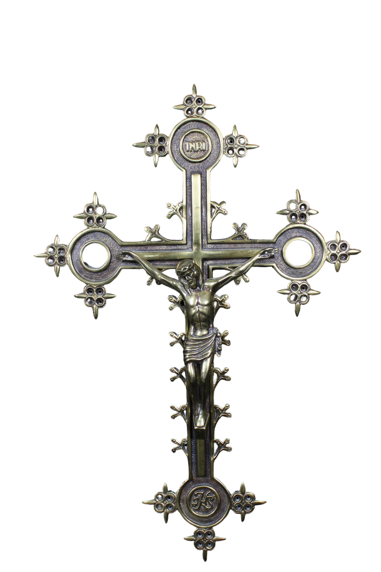 CROCIFISSO in bronzo con capi croce decorati da cerchi e cesellature Italia XX secolo h cm 52,5 x 35
