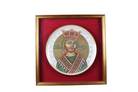 GRANDE PIATTO DA COLLEZIONE in porcellana decorata in Oro zecchino raffigurante Re di Sicilia manifattura Nicasio Catanese dentro teca in legno dorato Italia XX secolo cm Ø33,5 / cornice h cm 45,5 x 45,5