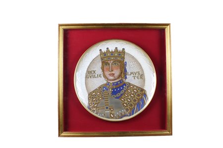 GRANDE PIATTO DA COLLEZIONE in porcellana decorata in Oro zecchino raffigurante Re di Sicilia manifattura Nicasio Catanese dentro teca in legno dorato Italia XX secolo cm Ø33,5 / cornice h cm 45,5 x 45,5