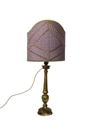 TORCERE in legno tornito e dorato ad argento e mecca montato a lume con paralume in tessuto Sicilia primi XIX secolo h cm 50 x 15 (paralume h 62)
