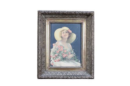 CORNICE in legno e pastiglia dorato contenente stampa colorata raffigurante figura femminile Francia XIX secolo h cm 32 x 23 /cornice h cm 50 x 42