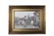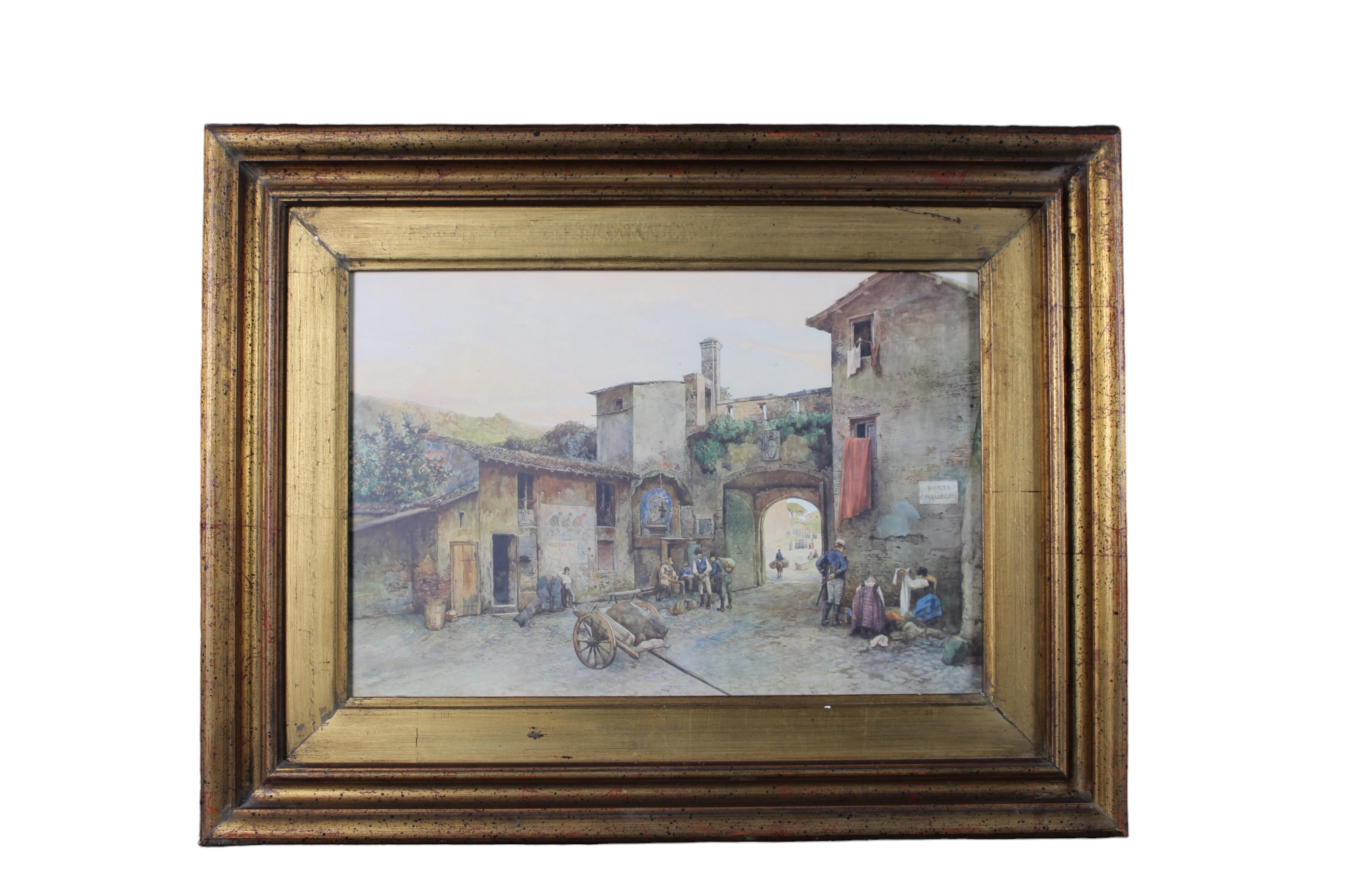 STAMPA COLORATA raffigurante cortile "Porta cavalleggeri" con personaggi cornice in legno dorata primi 900 h cm 33,5 x 46 / cornice h cm 43 x 55