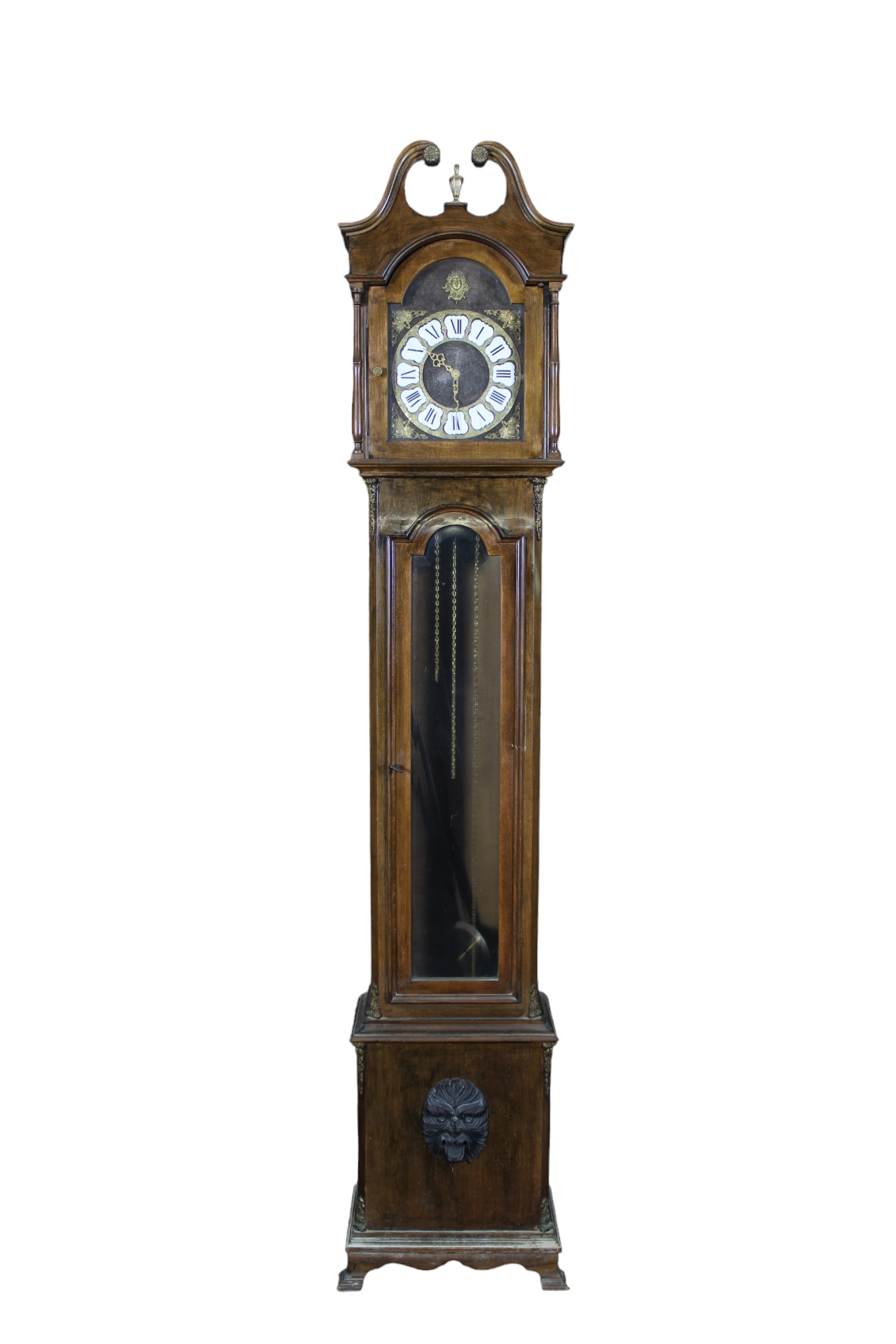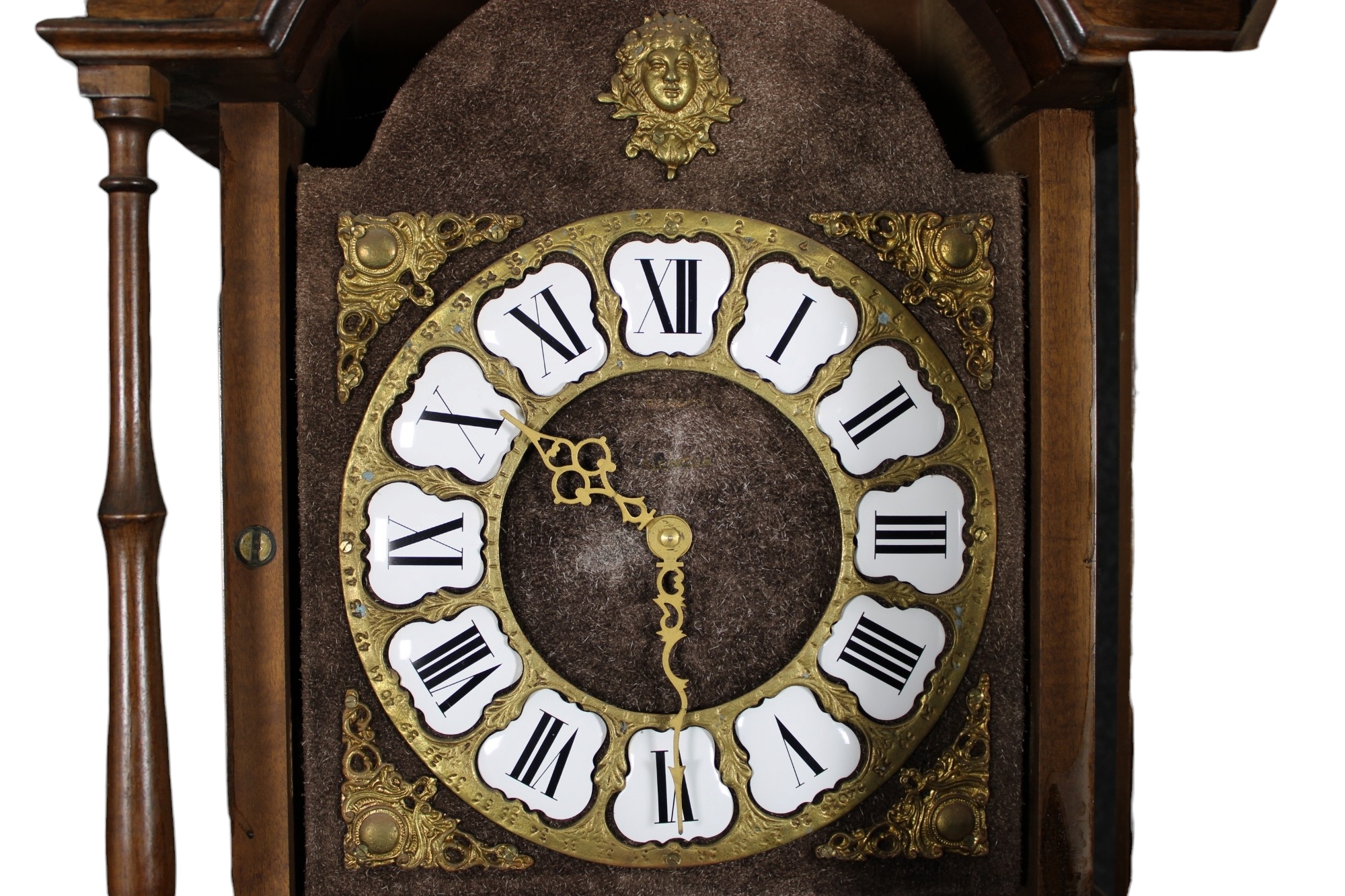 OROLOGIO A TORRE in legno di noce di gusto settecentesco con quadrante in bronzo e smalto firmato Kienzle con suoneria quarte mezze e ore Germania XX secolo h cm 202 x 40 x 24