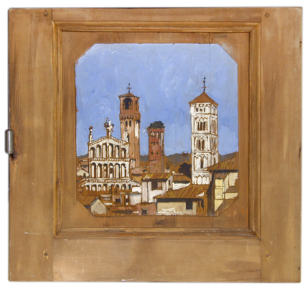 MASSIMO LOMI Livorno 1953 Lucca storica 2012 Tempera su tavola 49 x 54. Firma in b. al c.; sul verso etichette e timbro studio dell’artista. Autentica dell’autore su foto in esecuzione.