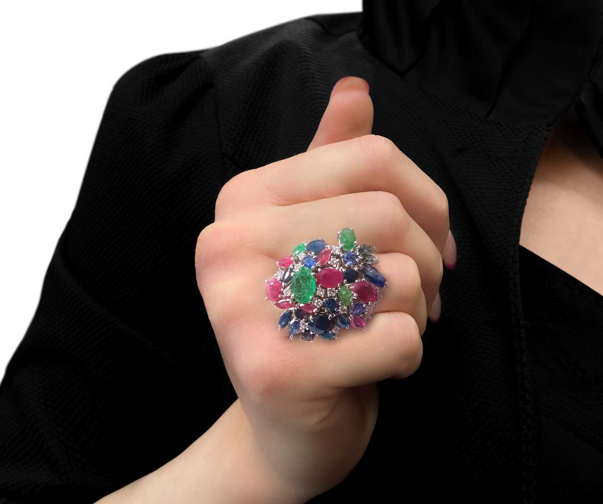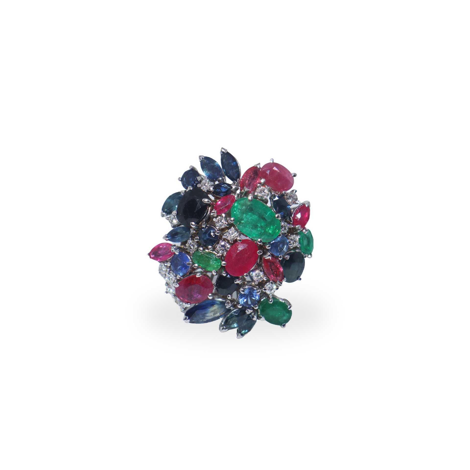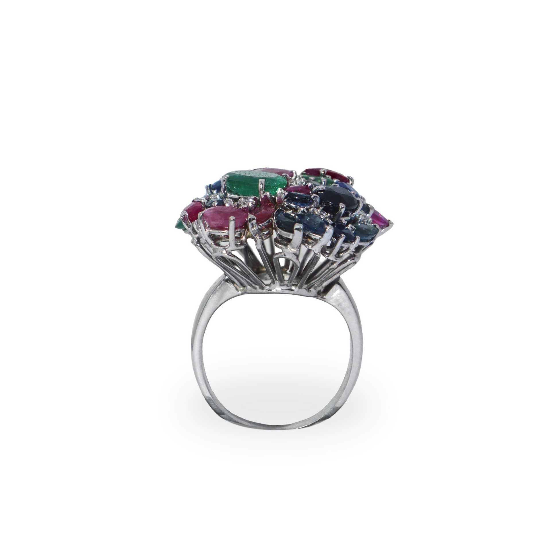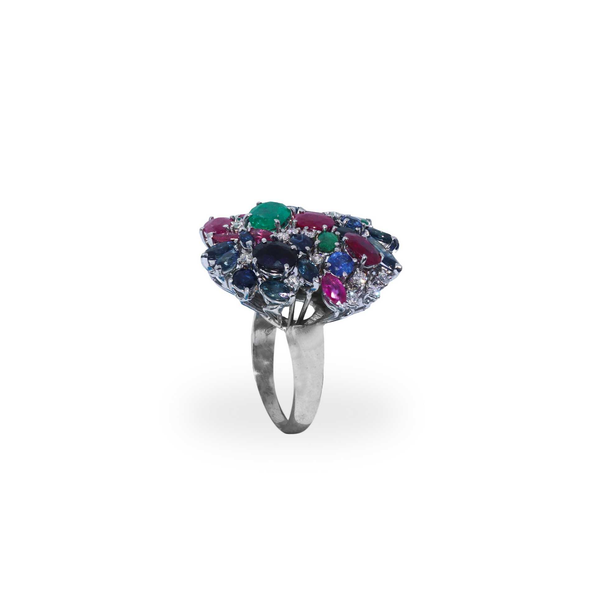 Anello in oro bianco 750 e pietre preziose: smeraldi, zaffini, rubini, diamanti taglio brillante