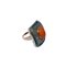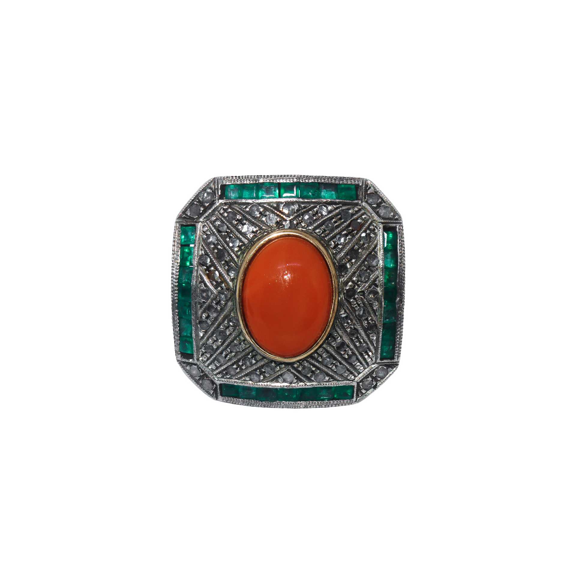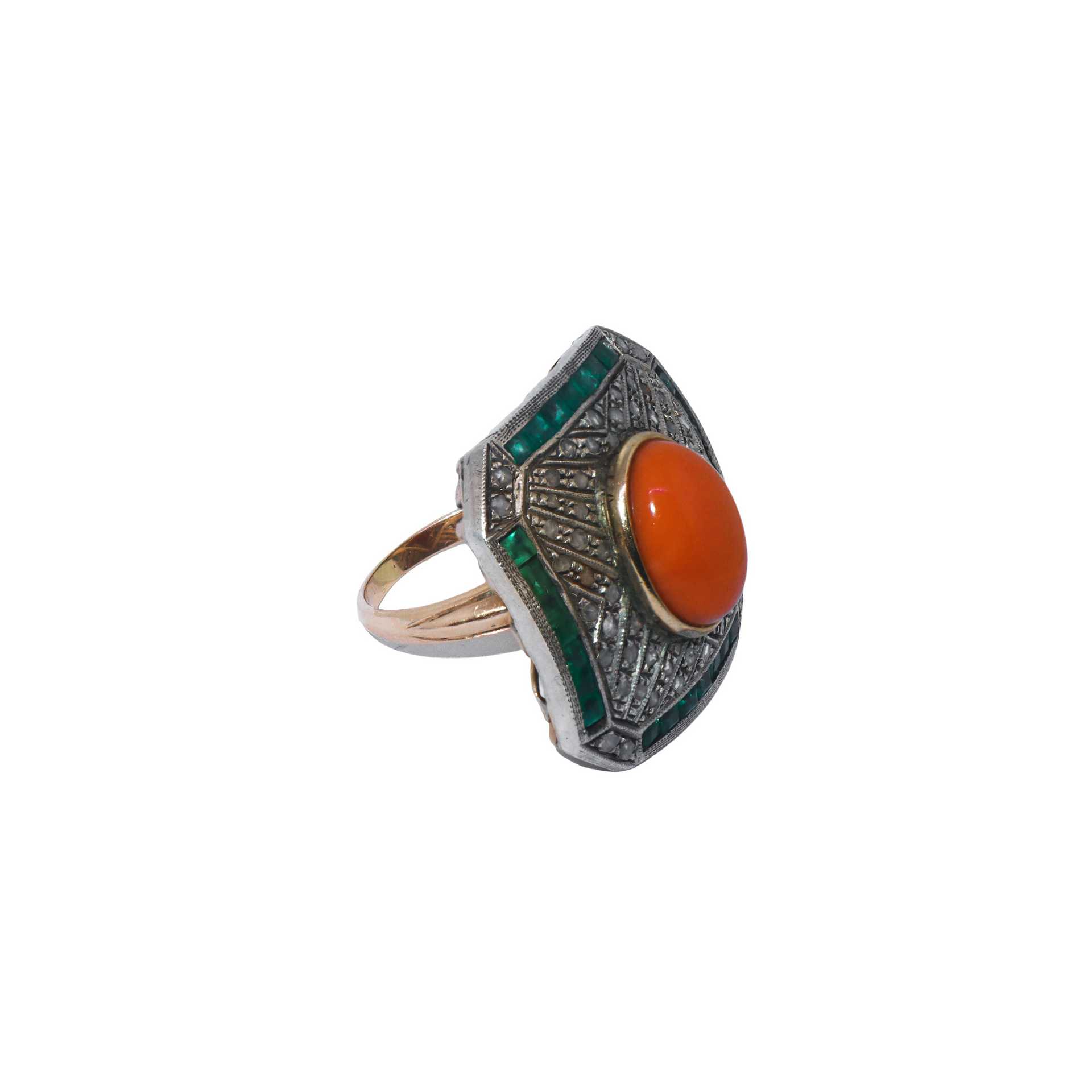 Anello in oro a basso titolo e argento con corallo centrale, scaglie di brillanti taglio antico e smeraldi