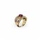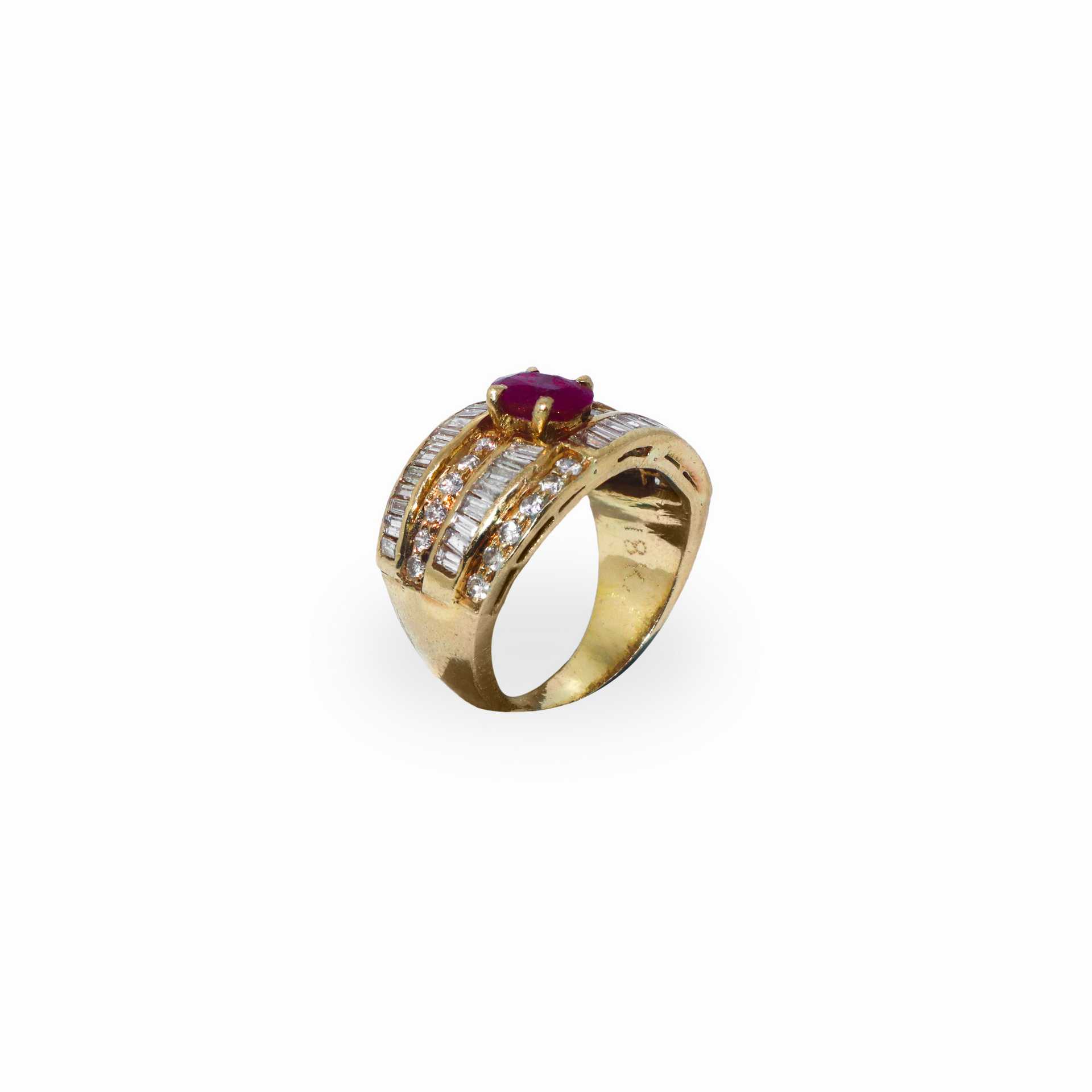 Anello in oro giallo 18 kt con rubino centrale e diamanti taglio brillante e taglio baguette