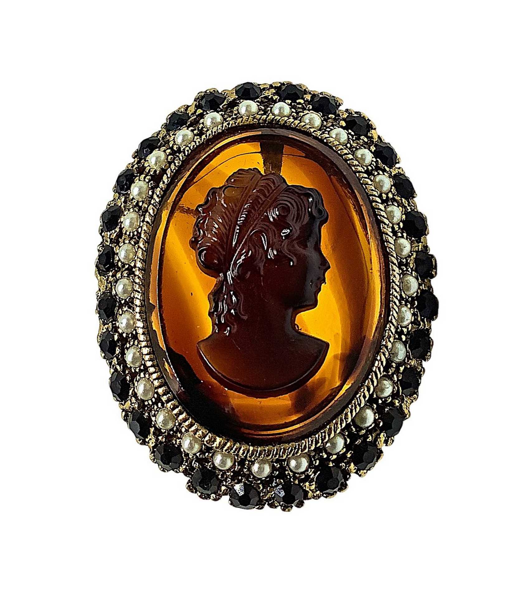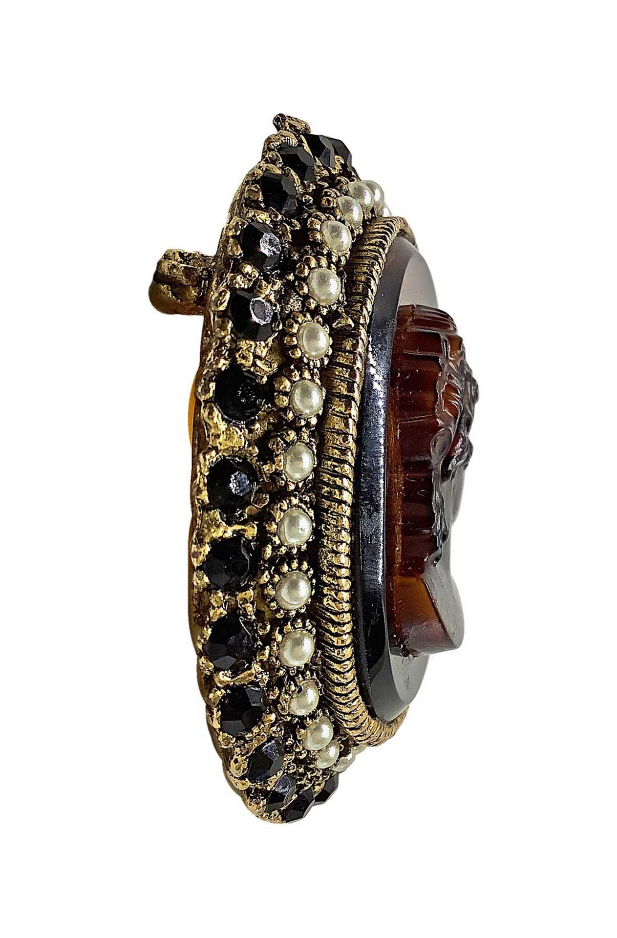 Spilla a pendentif con cammeo, 20° secolo 34,2 gr Lavorazione in pasta di vetro raffigurante volto di donna, contornata da piccole perline e pietre nereLavorazione in pasta di vetro raffigurante volto di donna, contornata da piccole perline e pietre nere