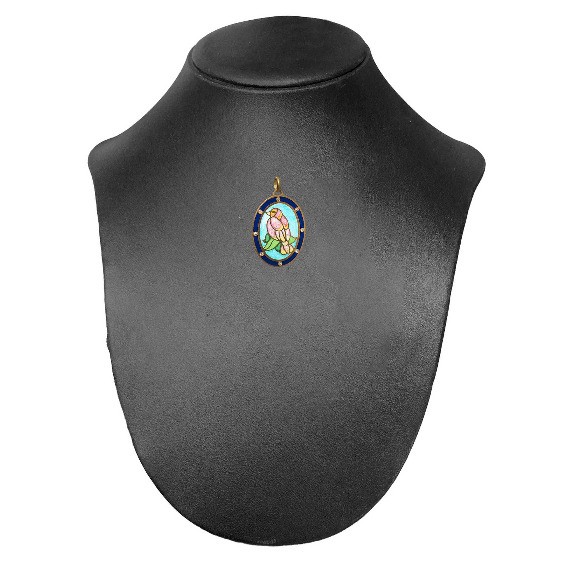 Ciondolo in oro a basso titolo e smalti policromi raffigurante un pappagallo