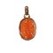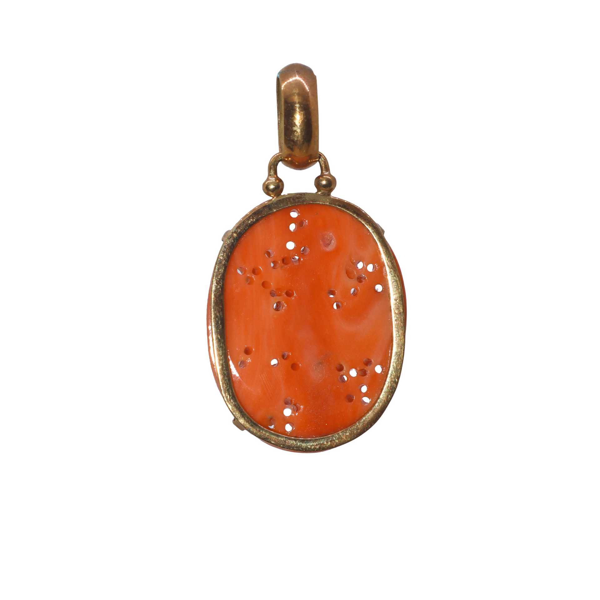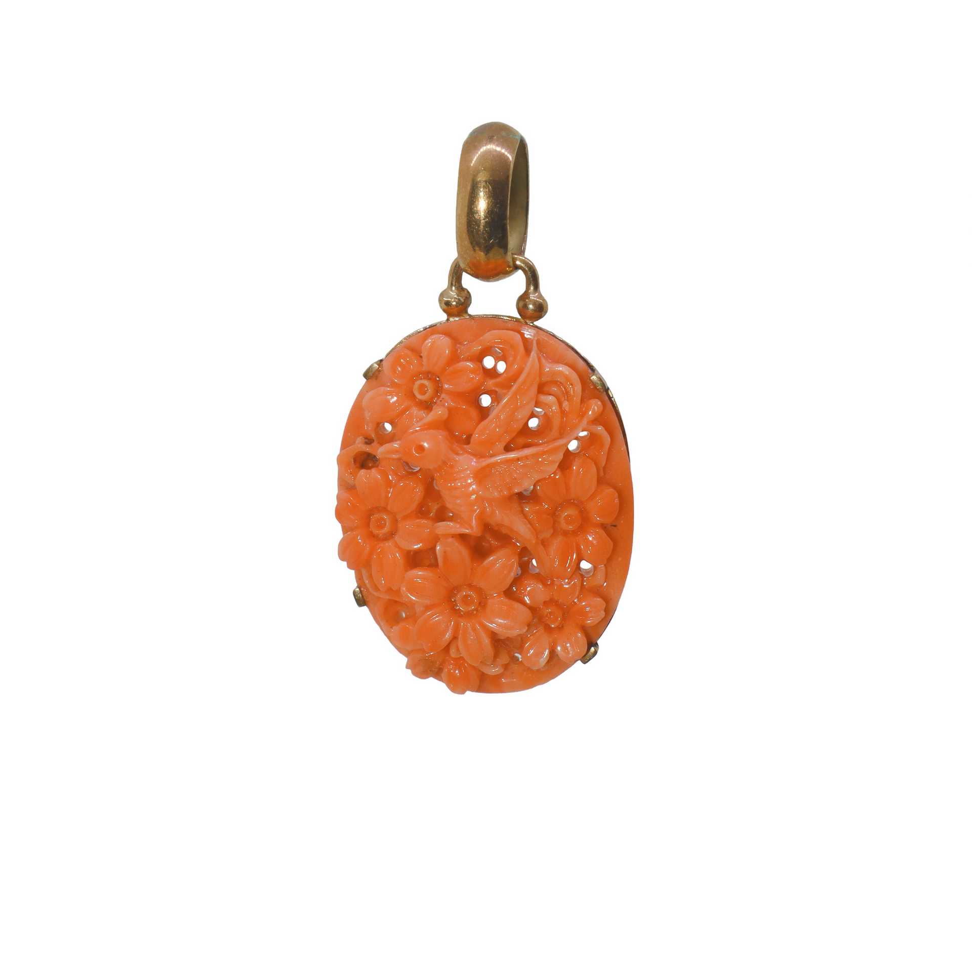 Ciondolo in oro a basso titolo e corallo rosa intarsiato con motivi floreali e uccello