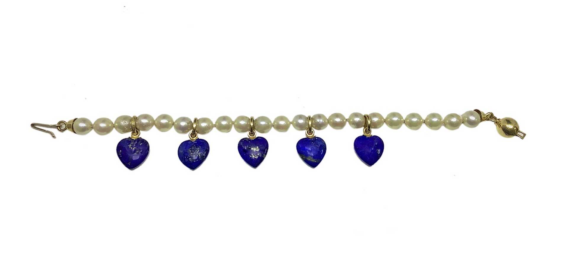 Bracciale con pendenti a forma di cuore Lunghezza cm 16 Bracciale In perle coltivate con pendenti n°4 a forma di cuore in lapislazzuli. Chiusura in oro Bracciale In perle coltivate con pendenti n°4 a forma di cuore in lapislazzuli. Chiusura in oro