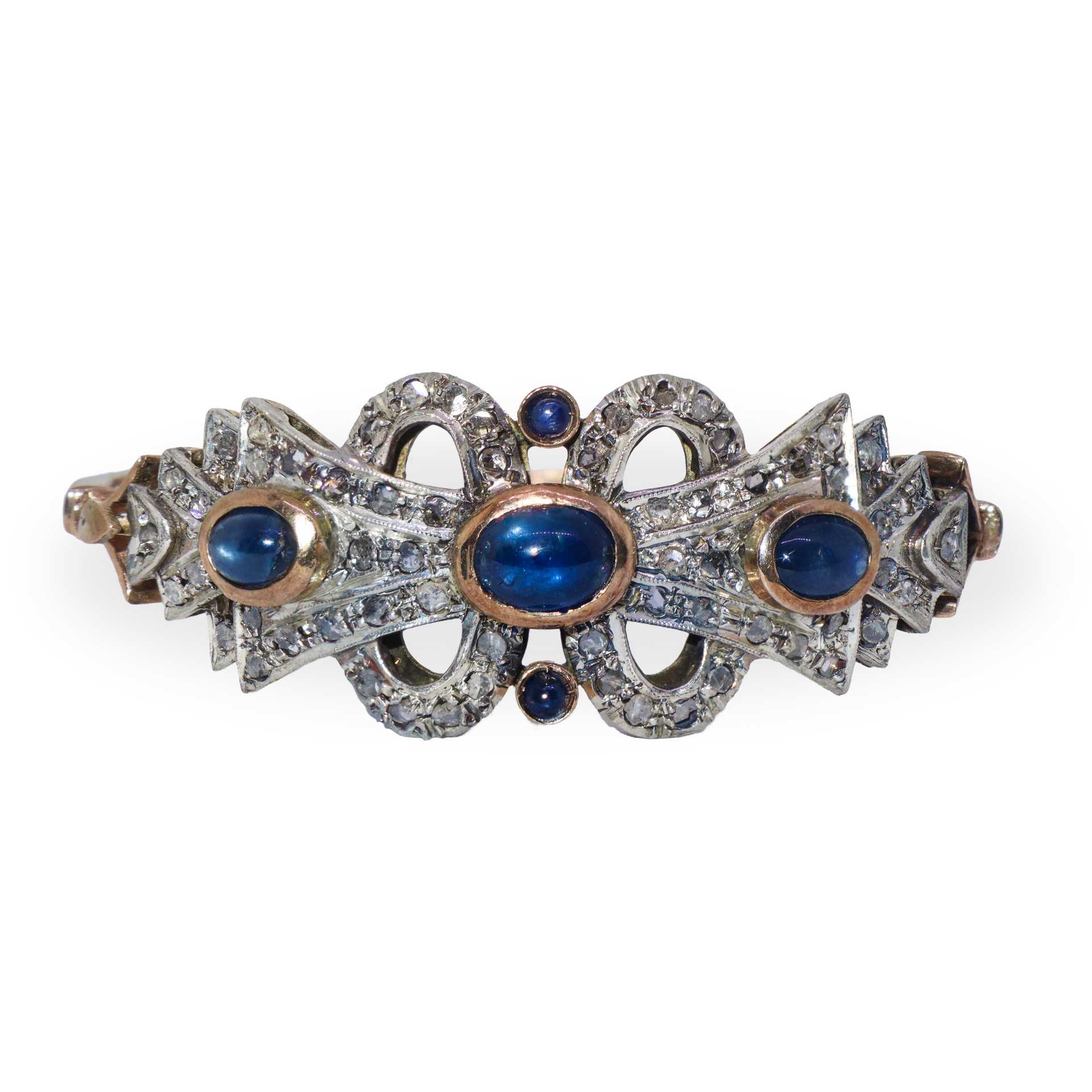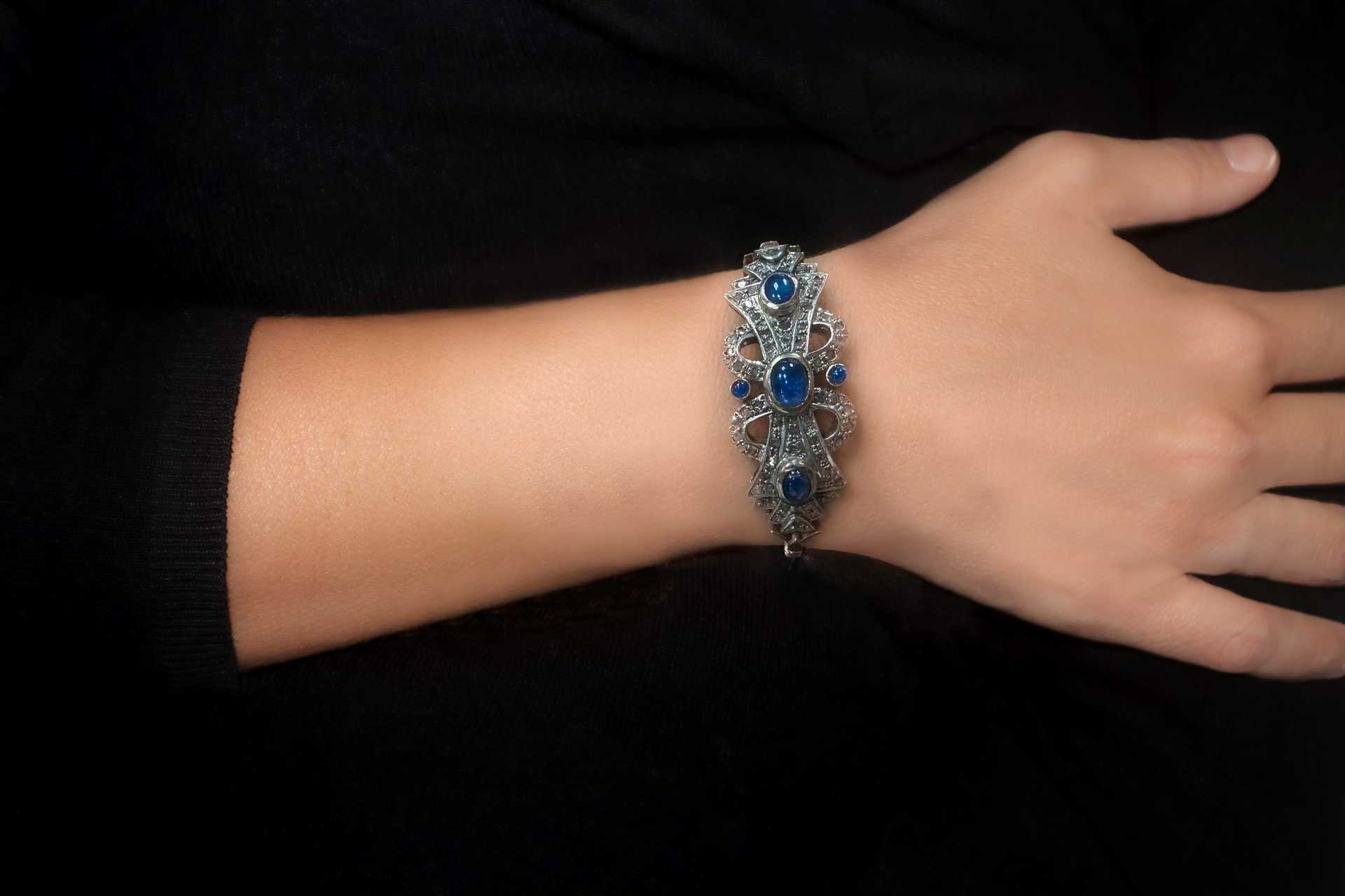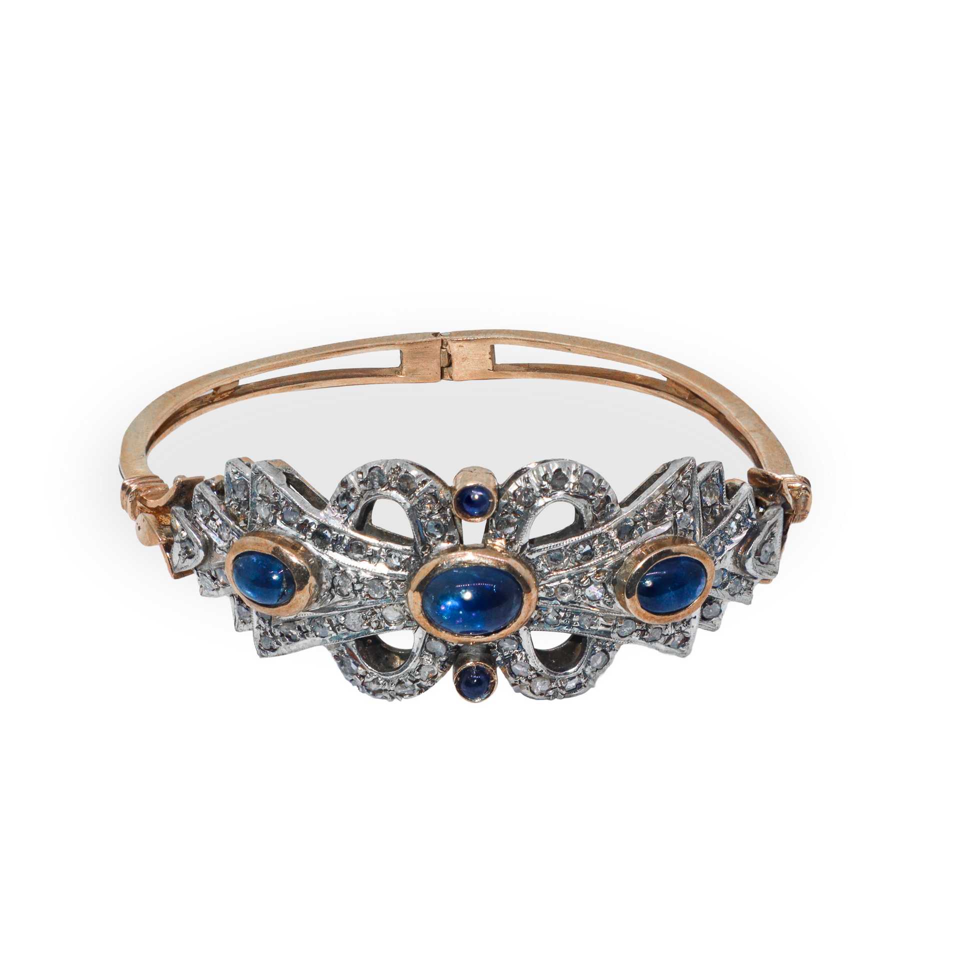 Bracciale rigido in oro 9 kt e argento con pietre azzurre e brillanti