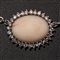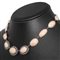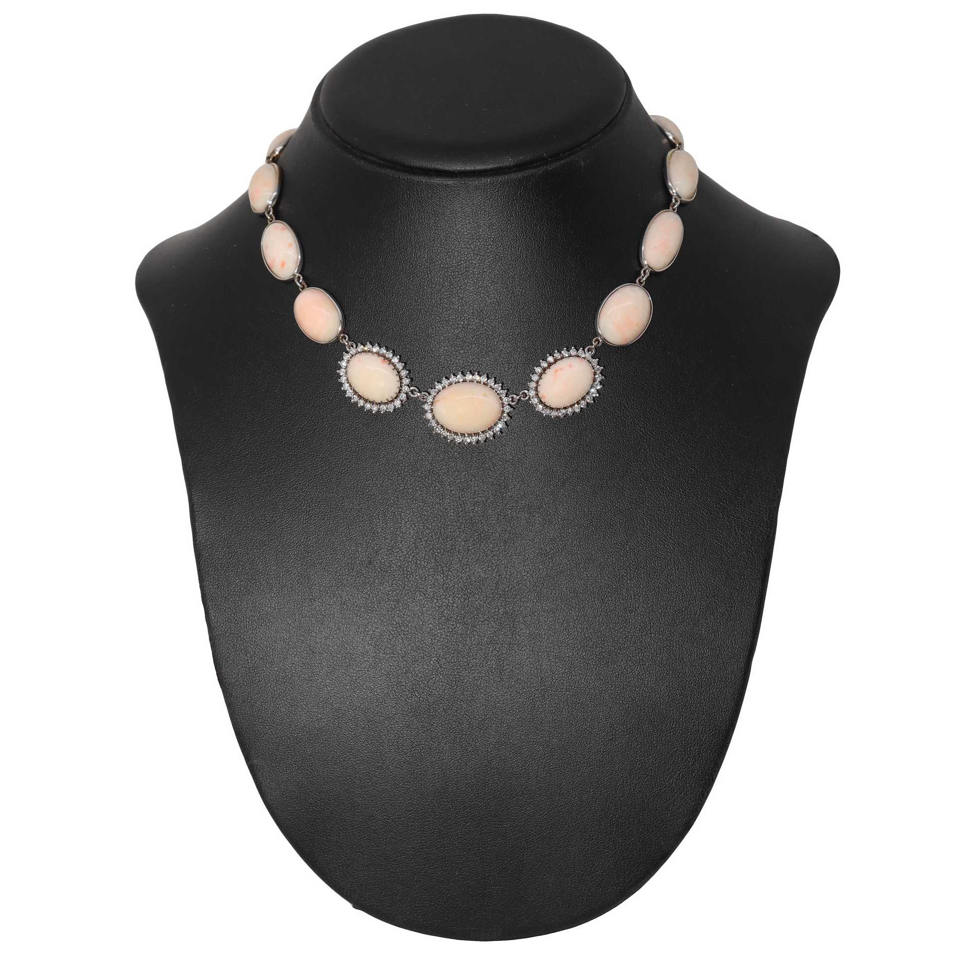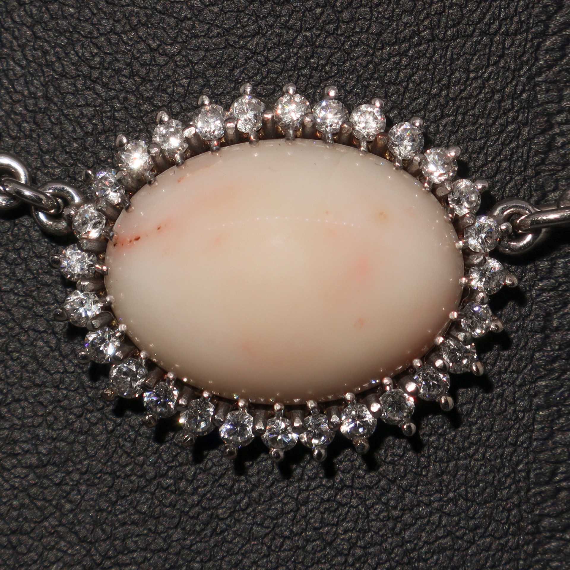 Collana in oro bianco con 13 ovali in corallo rosa Lunghezza complessiva 42 cm Con i tre centrali incastonati in una ghiera di piccoli brillanti.