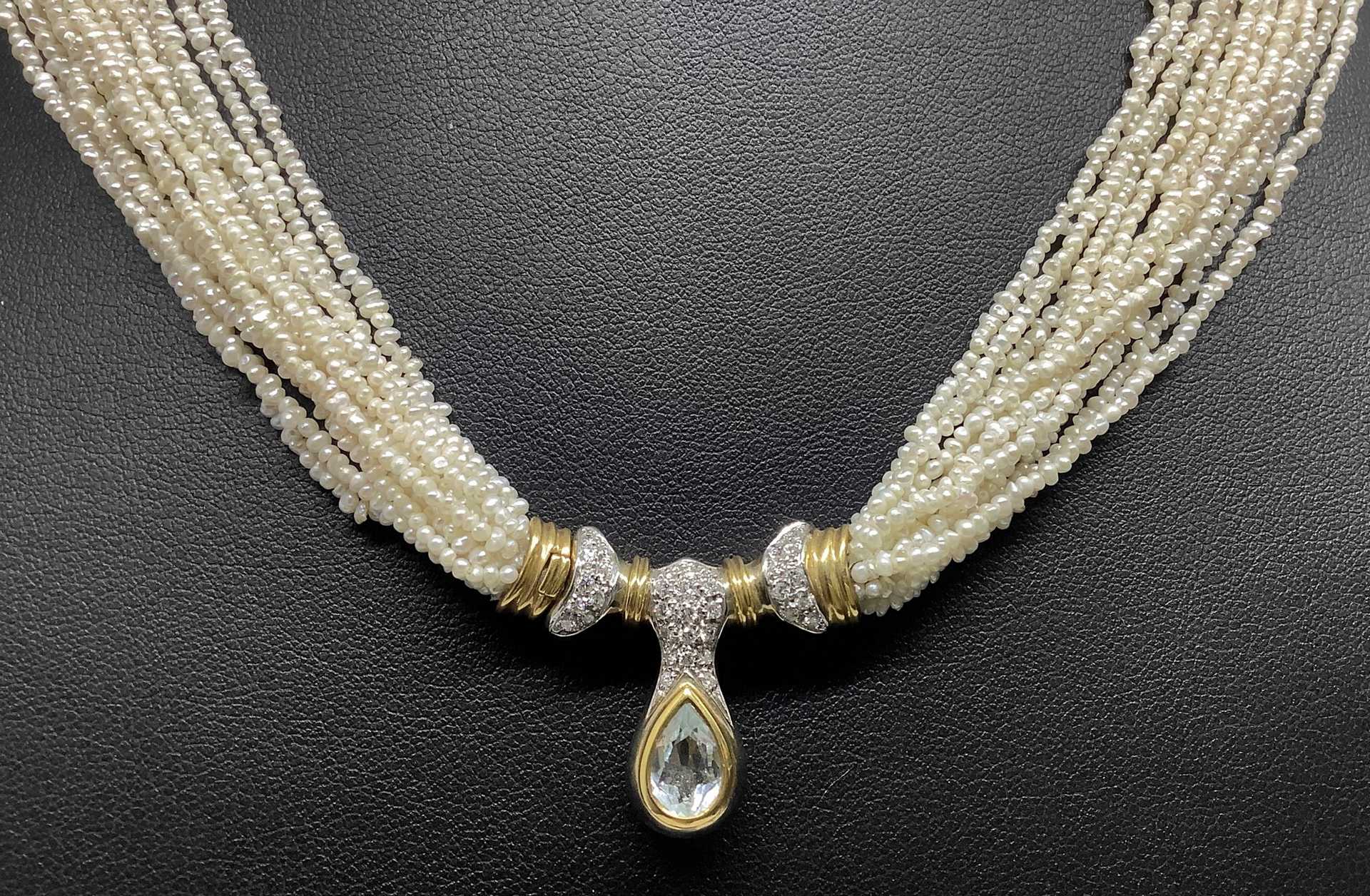 Collana con perle orientali naturali e chiusura centrale con brillanti ca 0,83 ct ed acquamarina ca 2.10 ct