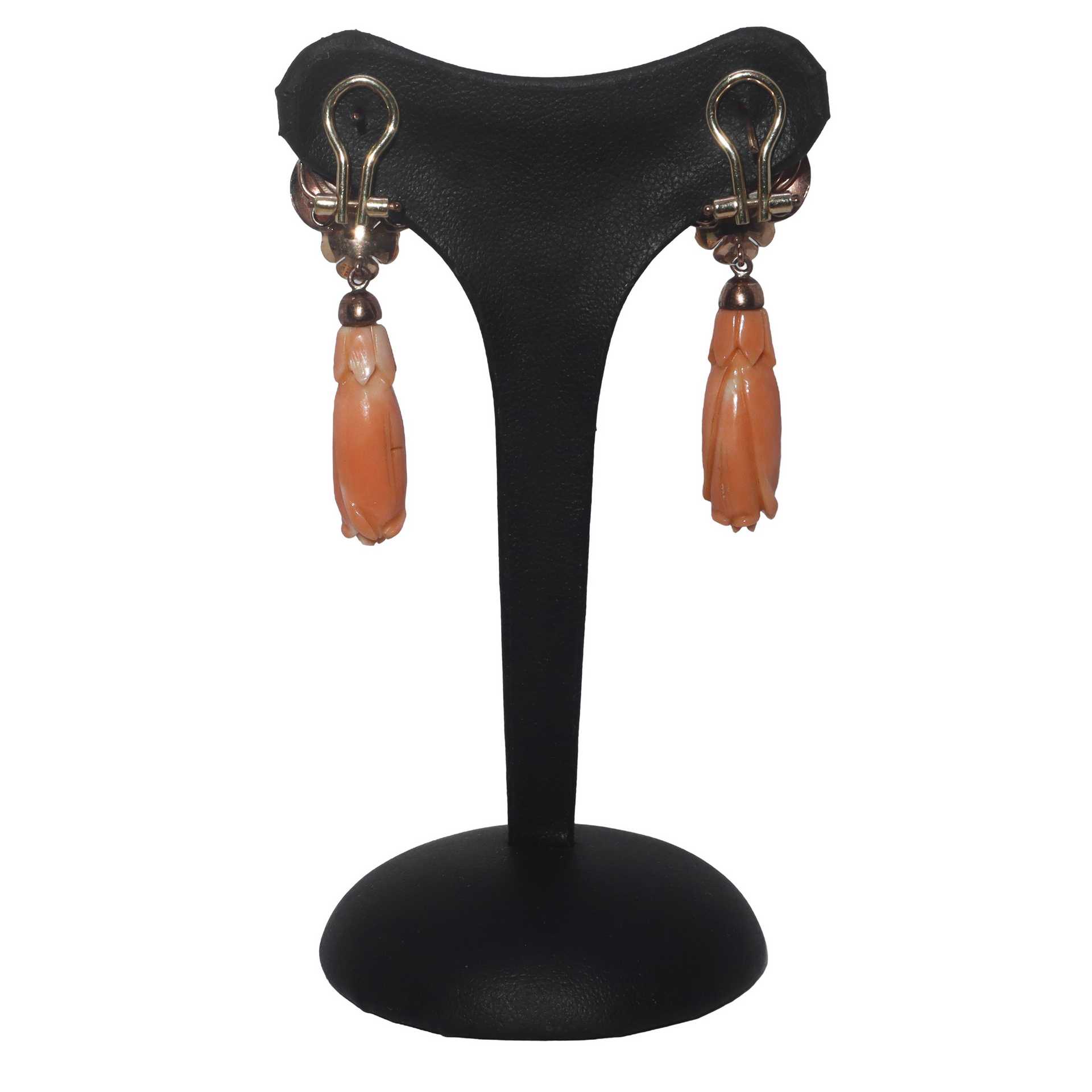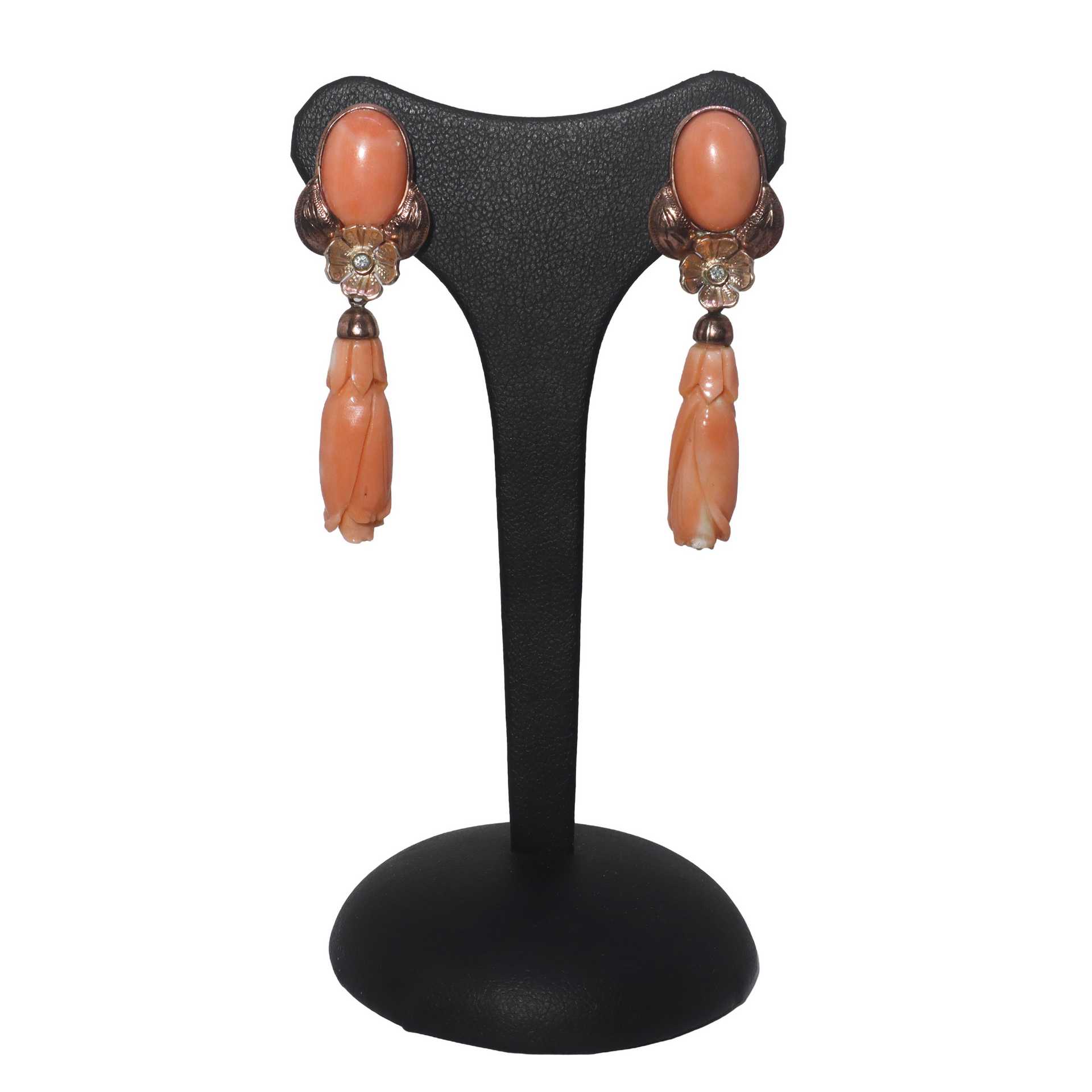Orecchini a clip pendenti in oro a basso titolo e corallo rosa a fiore