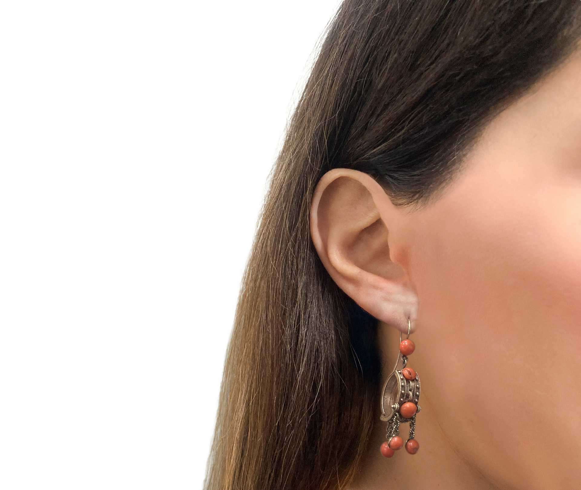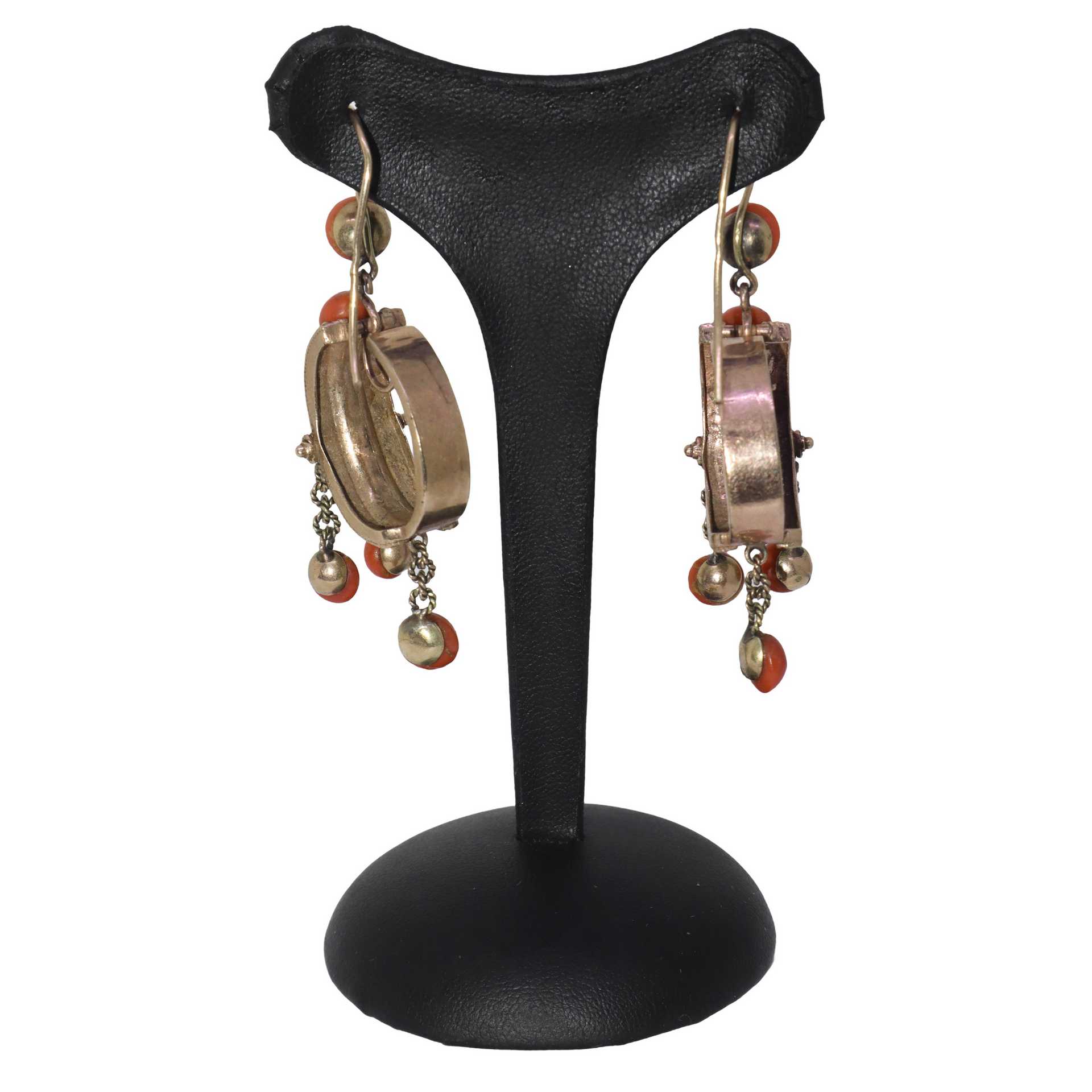 Orecchini con pendente a boccolo in oro giallo a basso titolo e corallo