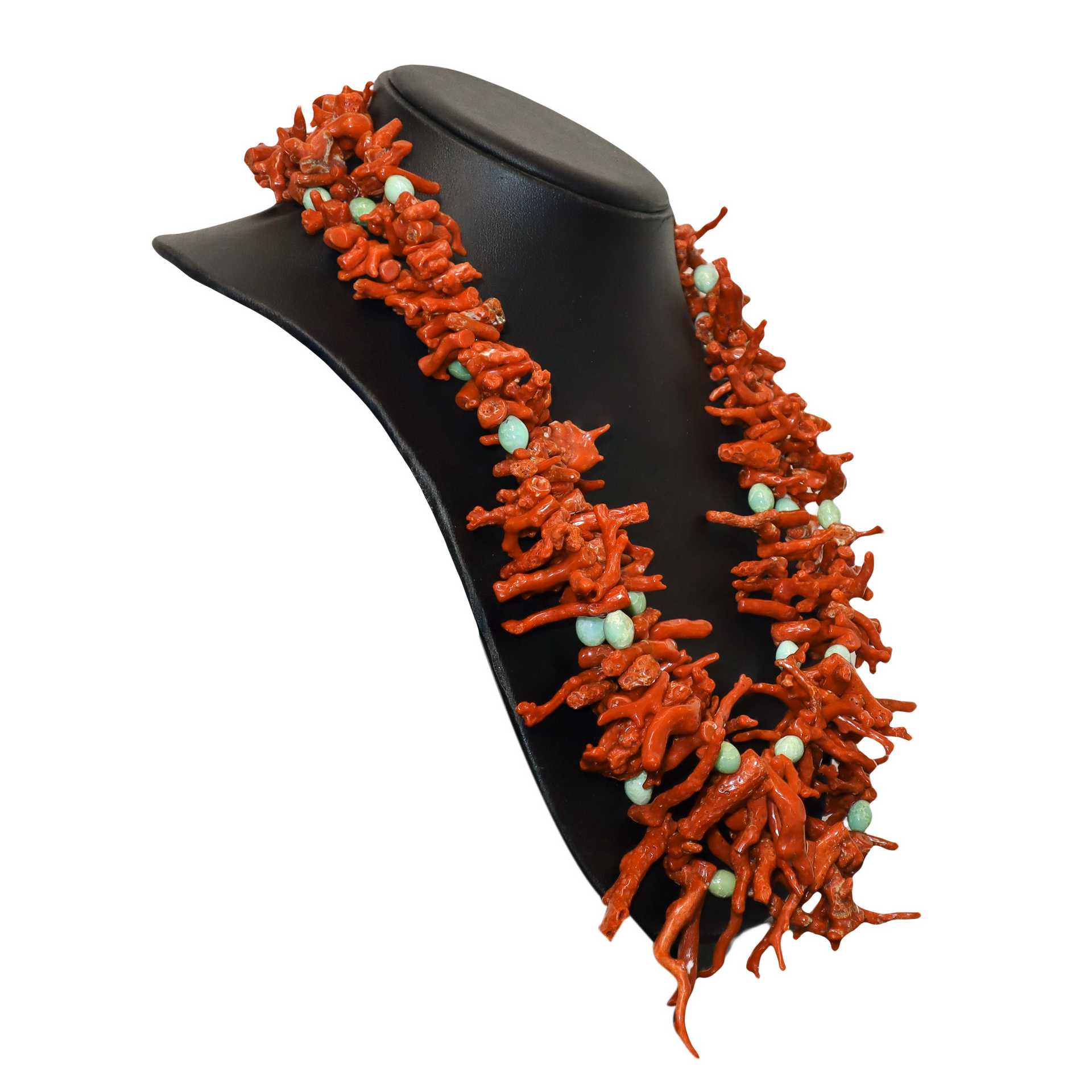Collana in corallo e turchese a tre fili con susta in argento lavorato cm 65