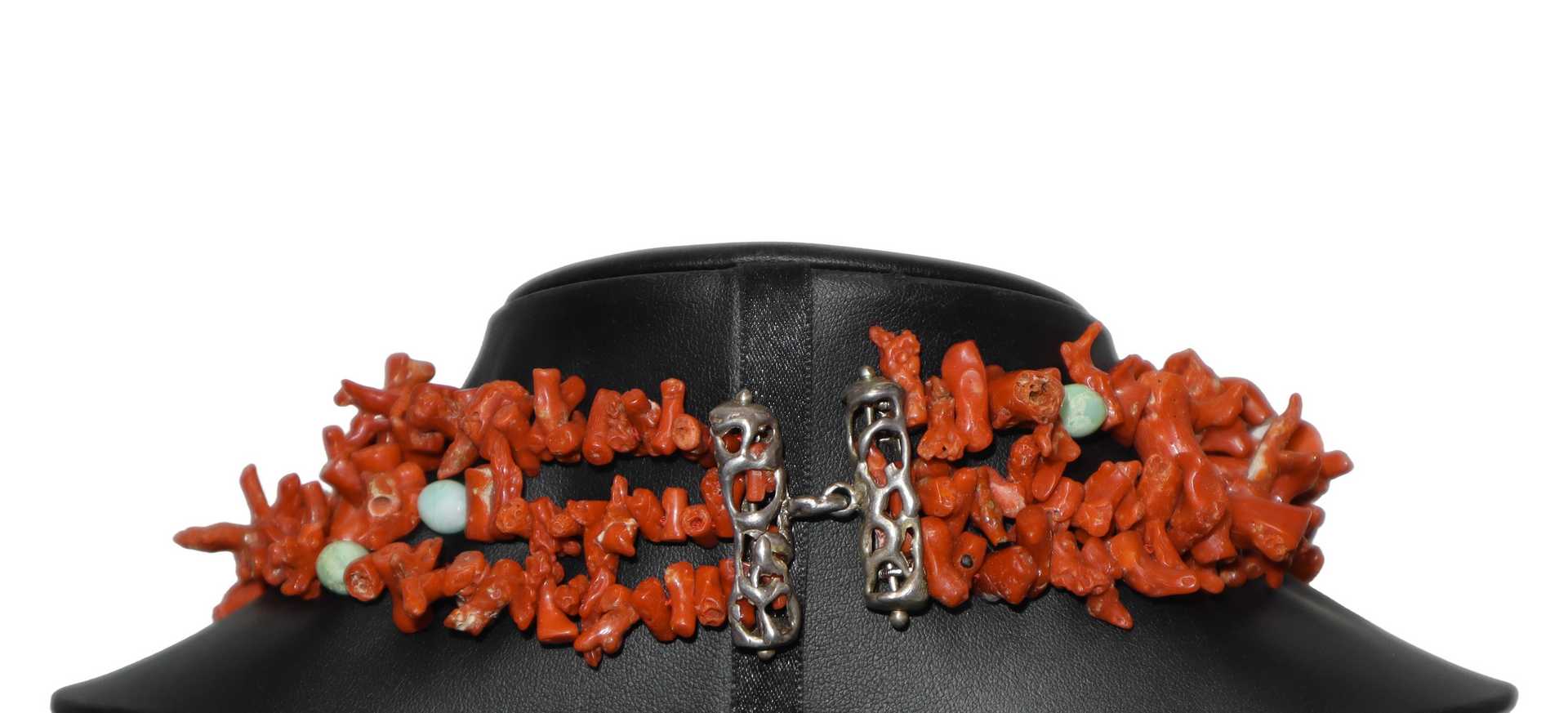 Collana in corallo e turchese a tre fili con susta in argento lavorato