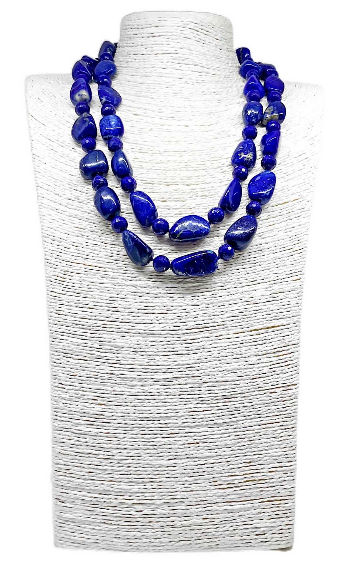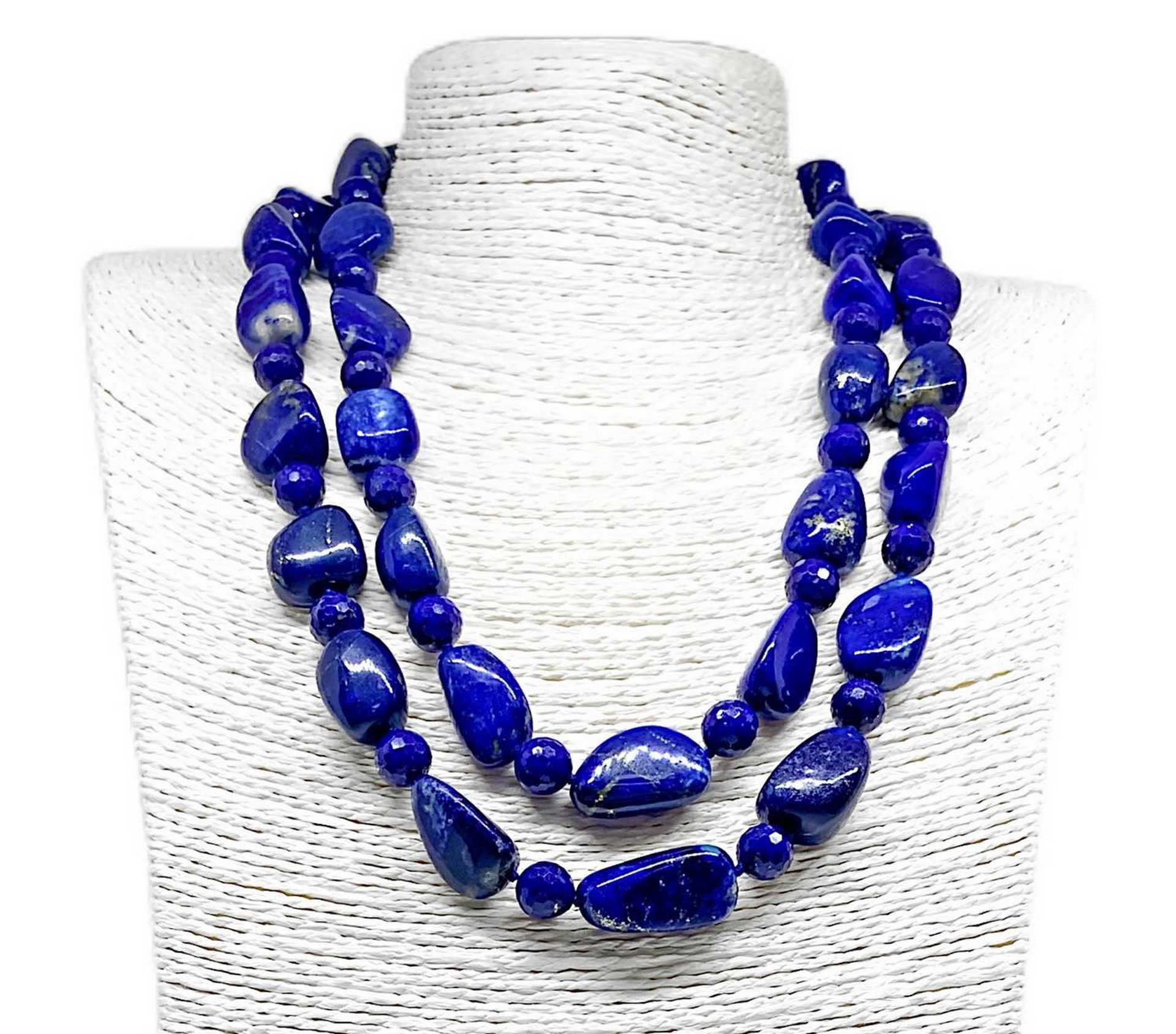 Collana due fili lapislazzuli a sfere sfaccettate alternate a sasso liscio.