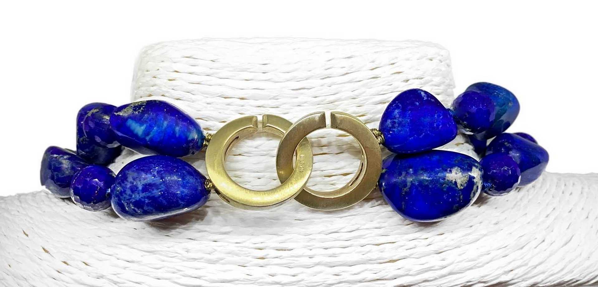 Collana due fili lapislazzuli a sfere sfaccettate alternate a sasso liscio. Lunghezza cm 60 Chiusura in Argento laccato Oro satinato. Diametro sfere mm 10Chiusura in Argento laccato Oro satinato. Diametro sfere mm 10