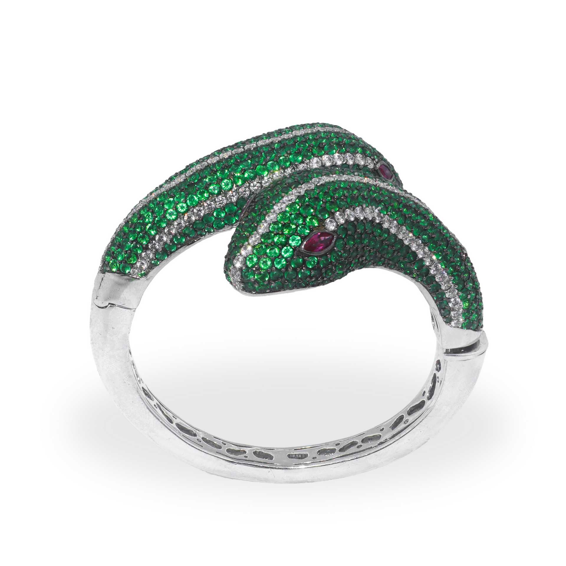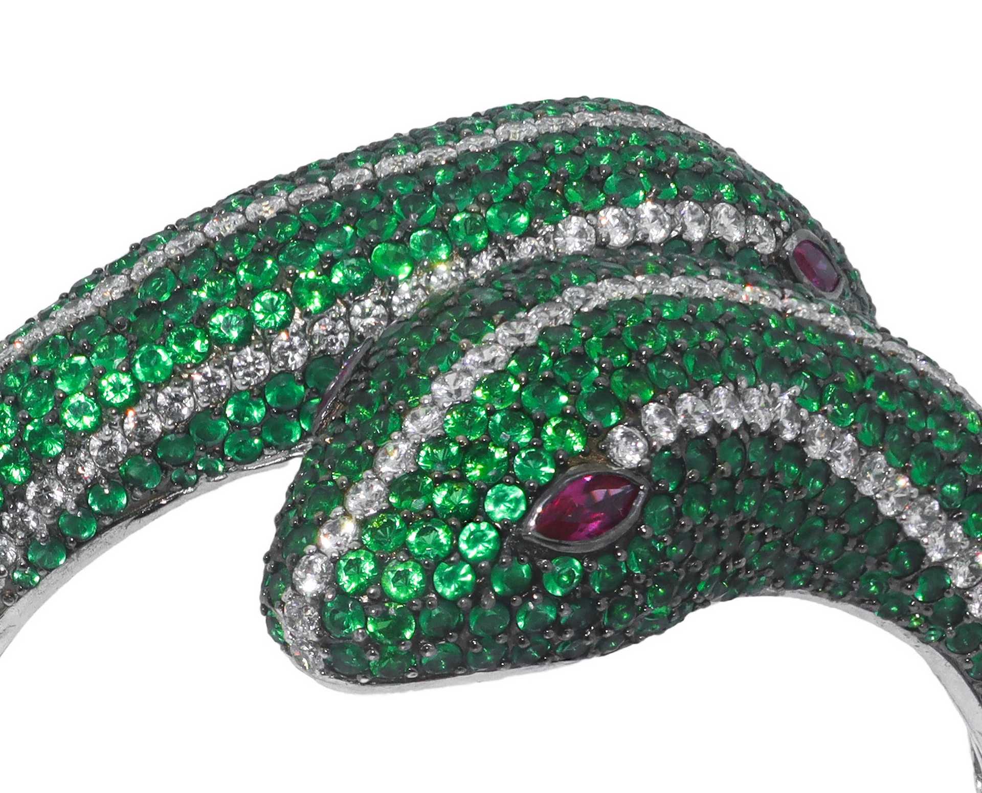 Bracciale rigido con apertura a scatto a forma di serpente in metallo argentato e strass