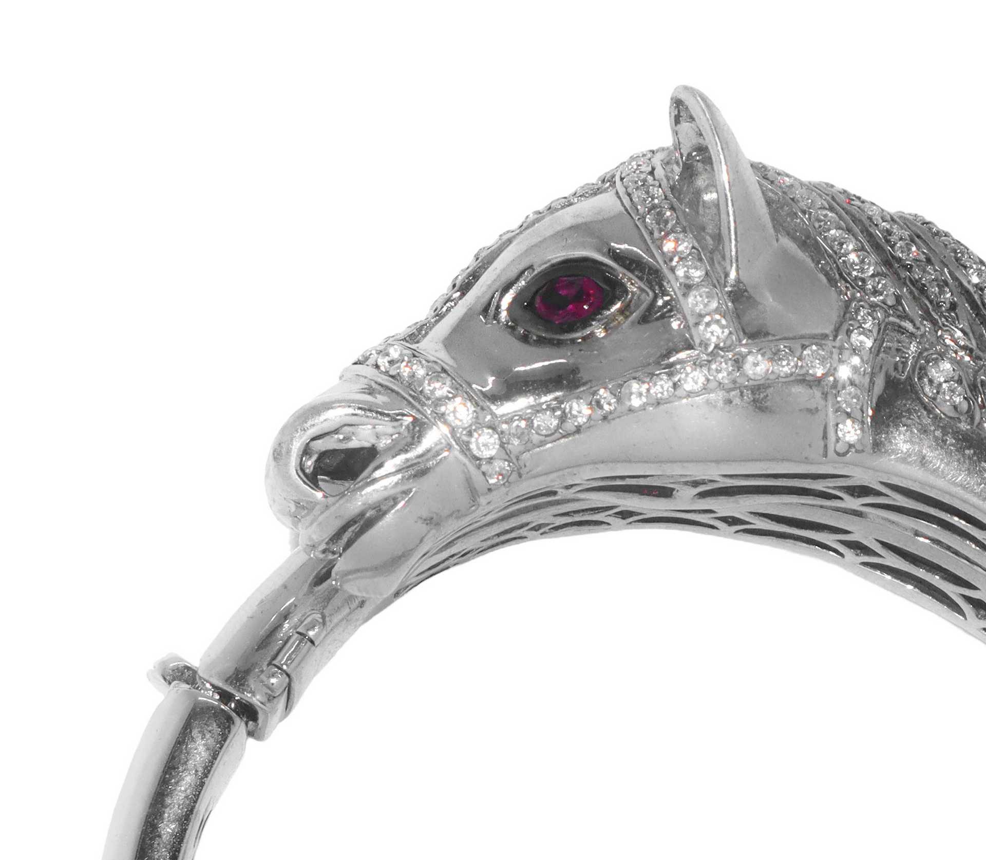 Lot 213 | Bracciale rigido con apertura a scatto e chiusura di sicurezza a forma di cavallo in metallo argentato e strass