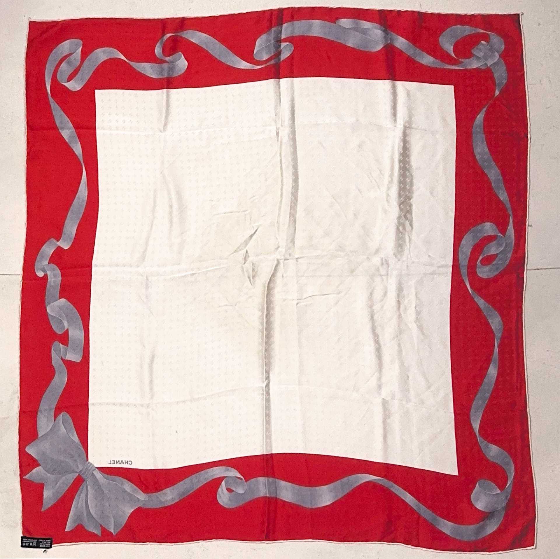Chanel - Foulard in seta con disegno a fiocco lungo il perimetro laterale cm 85X85 Marchio laterale in basso a destra. Lievi aloni sulla parte color panna.Marchio laterale in basso a destra. Lievi aloni sulla parte color panna.