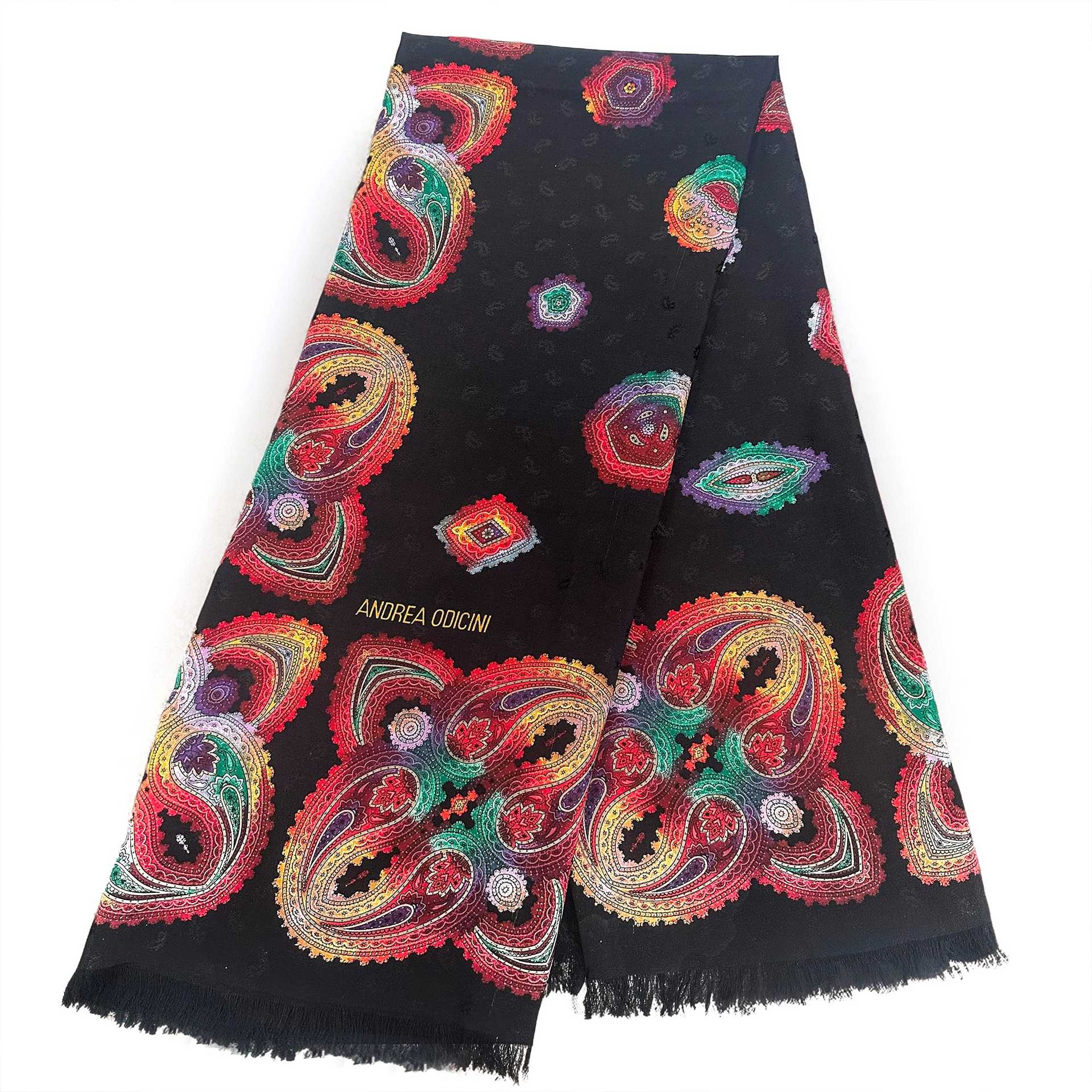 Andrea Odicini - Sciarpa Foulard in seta sfondo nero con motivi paisley colorati